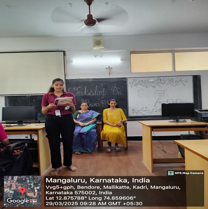 The Department of Statistics of St. Agnes College organized a workshop on Power BI to the students of Statistics ON 29th March 2025, Resource person was Ms Akanksha Jadav , hrough which students gained some knowledge on the application of Power BI for data visualization