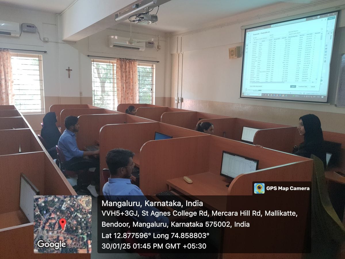 The Postgraduate Department of Big Data Analytics conducted a ‘Hands-on Workshop on Data Visualization’ on 30 January 2025. The resource person was Ms. Sara Sheik, Assistant Professor, Department of Computer Applications, St Agnes College (Autonomous), Mangaluru. Ms. Sara is an alumna of St Agnes College and is proficient in using Data Visualization tools. The participants were the students of the Big Data Analytics department. Sara commenced the workshop highlighting the importance of data visualization in the field of data analytics. Using example datasets, the participants created various charts and advanced visuals and explored various features available with data visualization tools to understand the importance of visualizing and analyzing data. The participants interacted with the resource person on the importance of creating dashboards as part of data visualization.