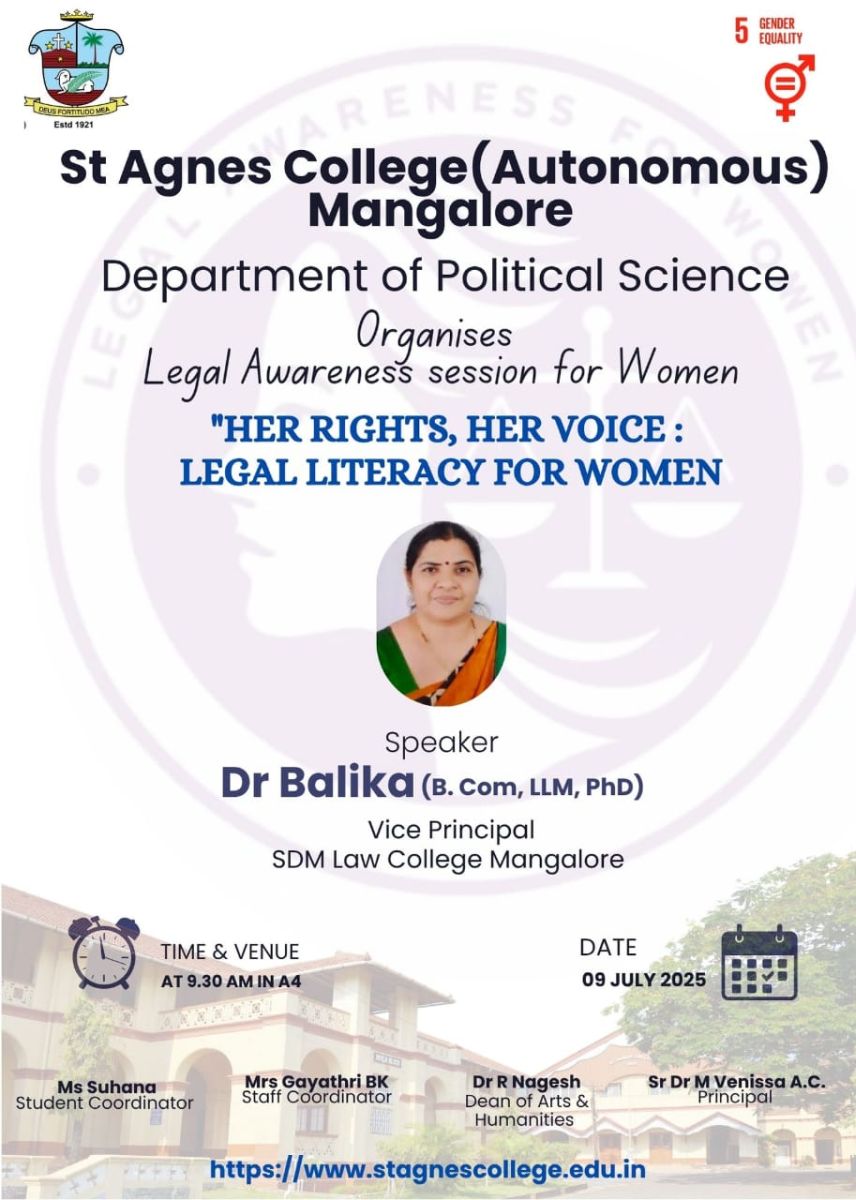The legal awareness session was a significant step towards promoting gender equality and empowering women through legal literacy at St. Agnes College.