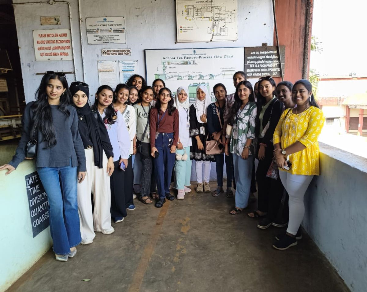 One of the key highlights of the trip was the industrial visit to “Harrison Malayalam Pvt. Ltd.,” a reputed tea plantation and processing company. At the tea factory, students observed the complete process of tea manufacturing, including withering, rolling, fermentation, drying, grading, and packaging. The visit offered valuable insights into large-scale production techniques, quality control measures, and hygiene standards maintained in the industry. Students also had the opportunity to explore and purchase various flavors of tea.