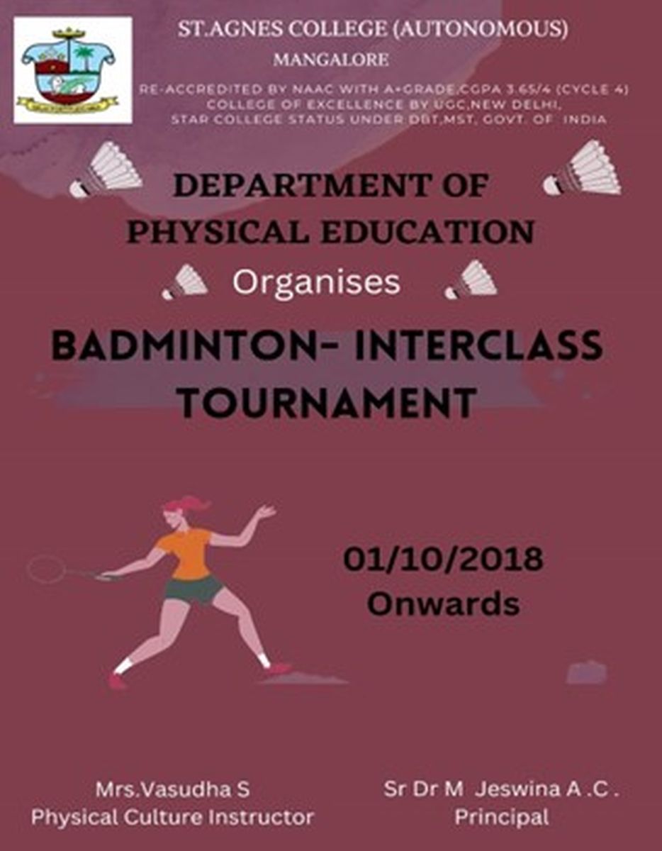 The Department of Physical Education, St Agnes College (Autonomous), Mangaluru conducted an Interclass Badminton Tournament on 1 October 2018, where 84 students participated in total, with each class having 4 participants.