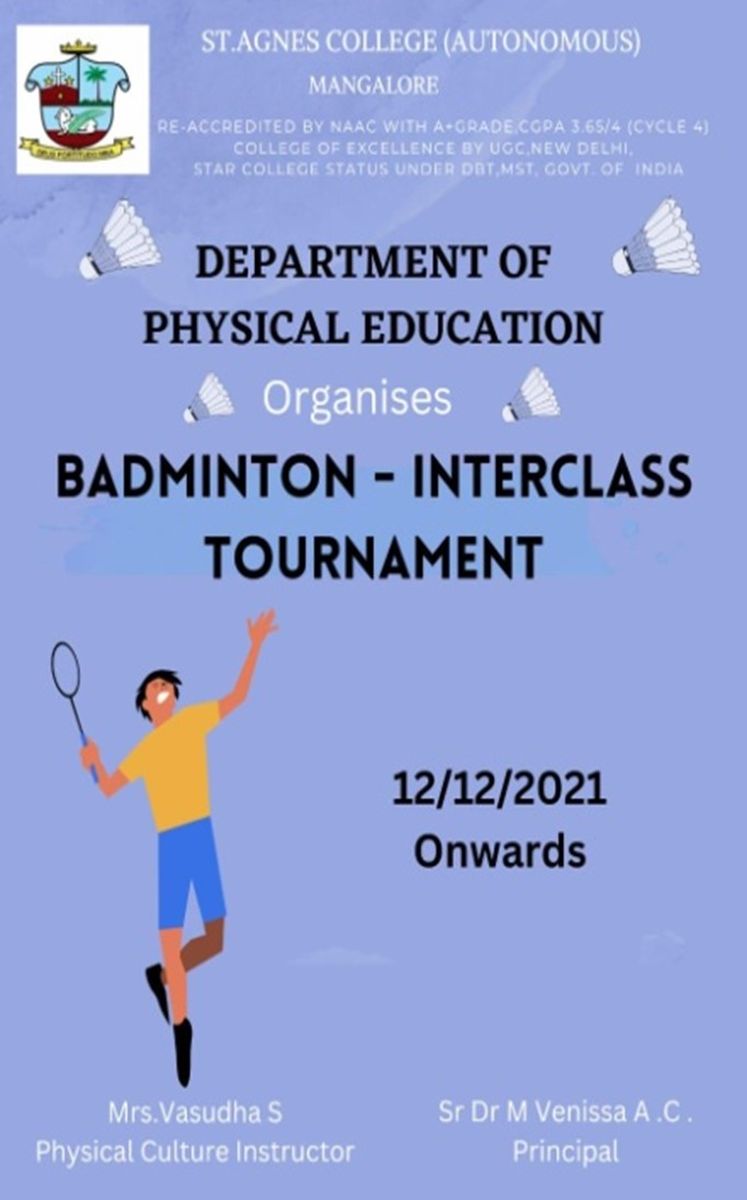 The Department of Physical Education, St Agnes College (Autonomous), Mangaluru conducted an Interclass Badminton Tournament on 12 December 2021, with 94 students participating, and each class being represented by 4 participants.