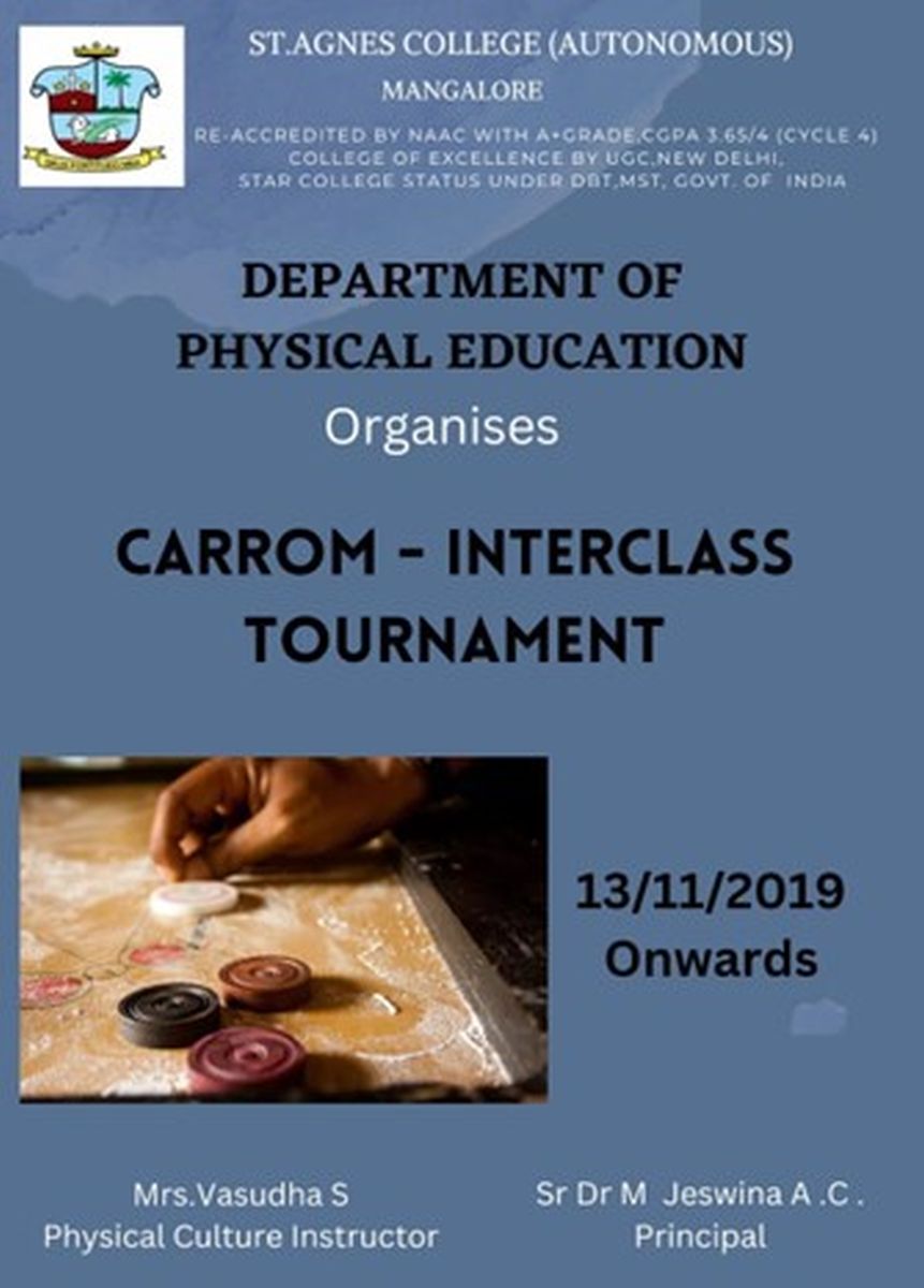 The Department of Physical Education, St Agnes College (Autonomous), Mangaluru conducted an Interclass Carrom Tournament on 13 November 2019, with 104 students participating, and each class being represented by 4 participants.