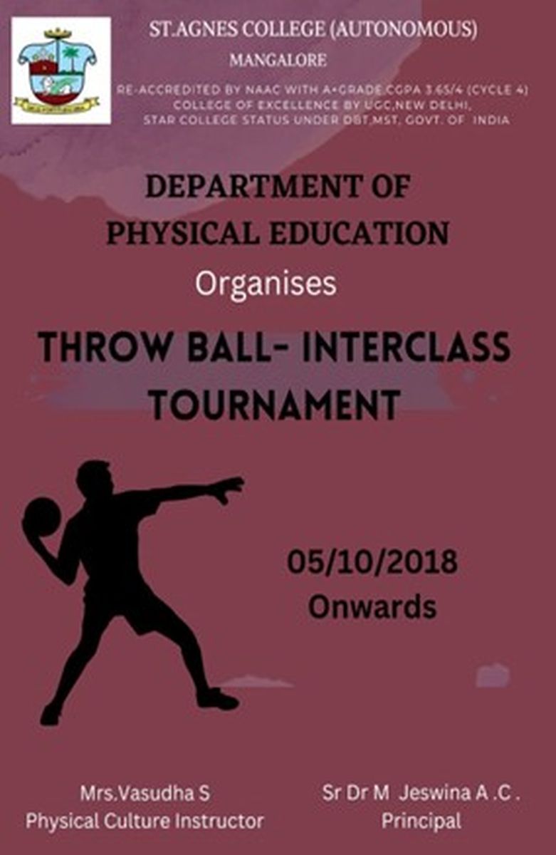 The Department of Physical Education, St Agnes College (Autonomous), Mangaluru organized an Interclass Throwball Tournament on 5 October 2018 with a total number of 252 students participating, and each class being represented by 12 participants.
