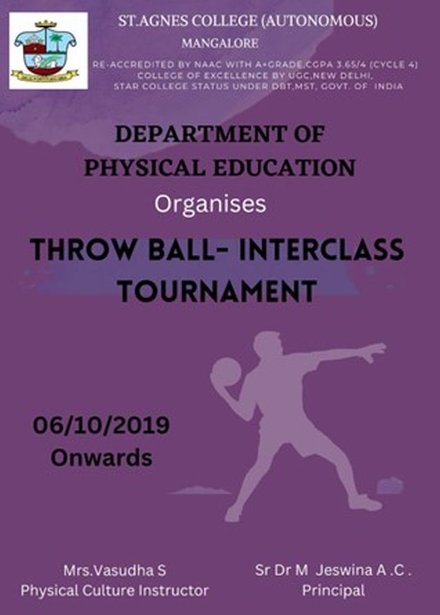 The Department of Physical Education, St Agnes College (Autonomous), Mangaluru conducted an Interclass Throwball Tournament on 6 October 2019, with 252 students participating, and each class having 12 participants.
