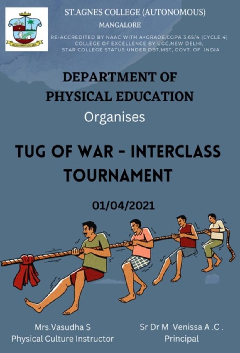 The Department of Physical Education, St Agnes College (Autonomous), Mangaluru hosted an Interclass Tug of War Tournament on 1 April 2021, with a total of 207 students participating, and each class being represented by 12 participants.