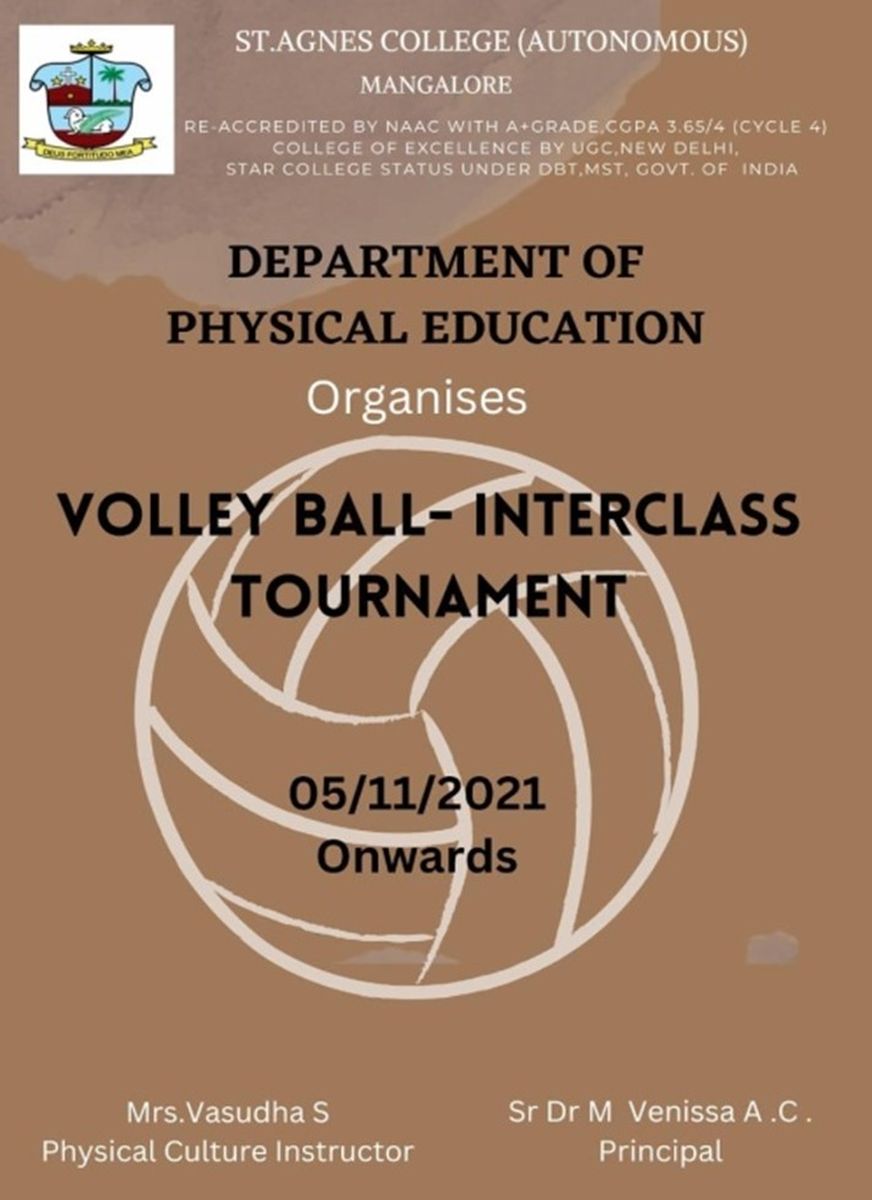 The Department of Physical Education, St Agnes College (Autonomous), Mangaluru hosted an Interclass Volleyball Tournament on 5 November 2021, where 192 students participated, with each class having 12 participants.