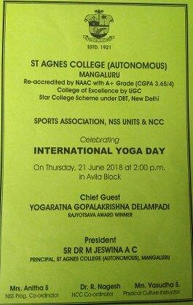On 21 June 2018, the Sports Association, in association with NSS and NCC, St Agnes College (Autonomous), Mangaluru organized International Yoga Day at Avila Block. Yogaratna Gopalkrishna Delampadi, Rajyotsava Award Winner was the chief guest. 150 students participated in this event.