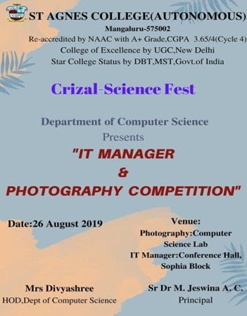 As a part of the Science Fest, the Department of Computer Science, St Agnes College (Autonomous), Mangaluru conducted two competitions: Photography and IT Manager on 26 August 2019. The preliminary round of IT Manager was conducted on 23 August 2019 in A2. 21 students participated in the photography event and 18 students participated in the IT Manager event.