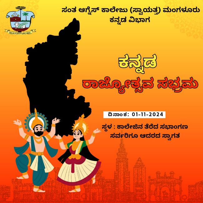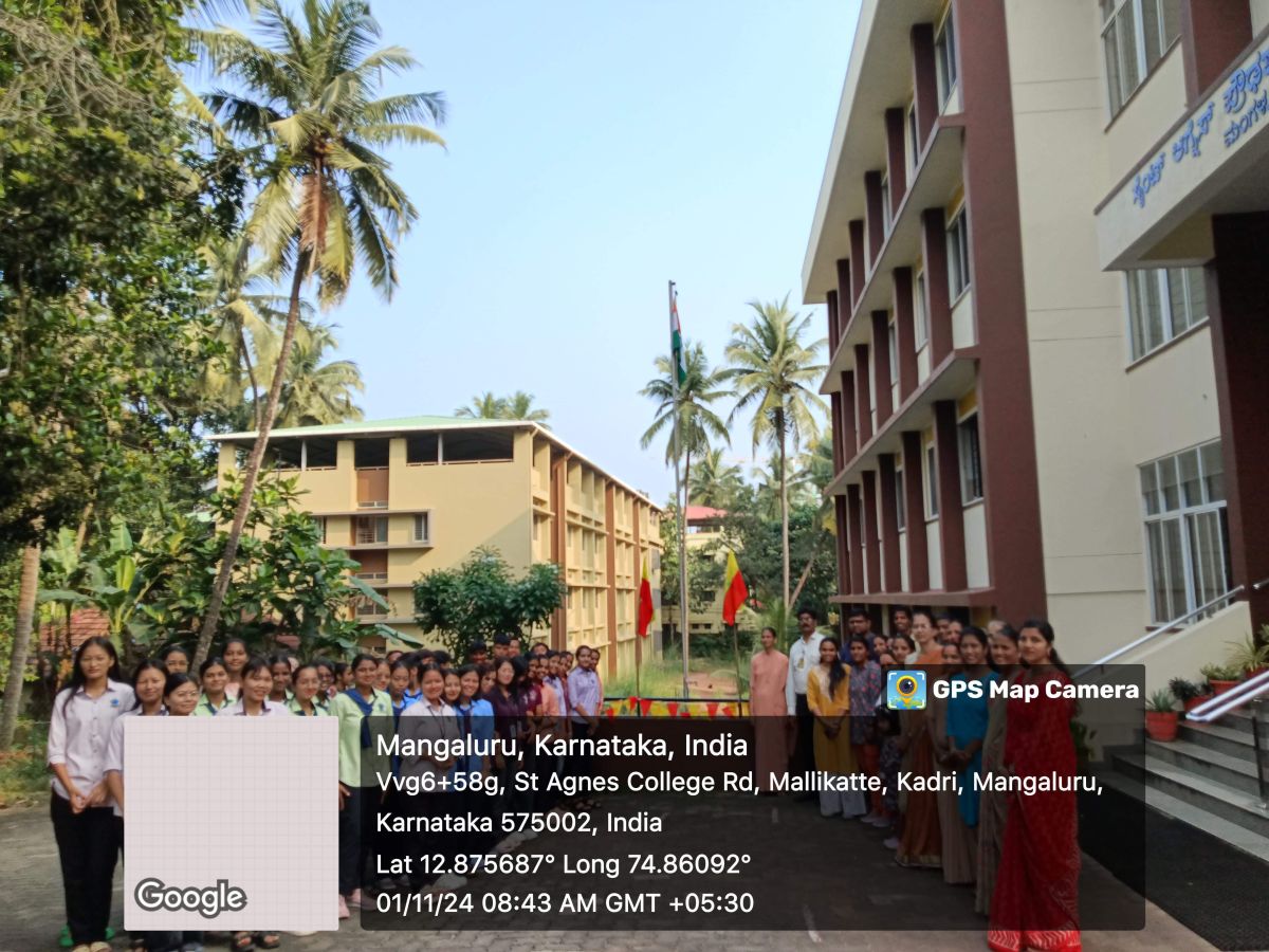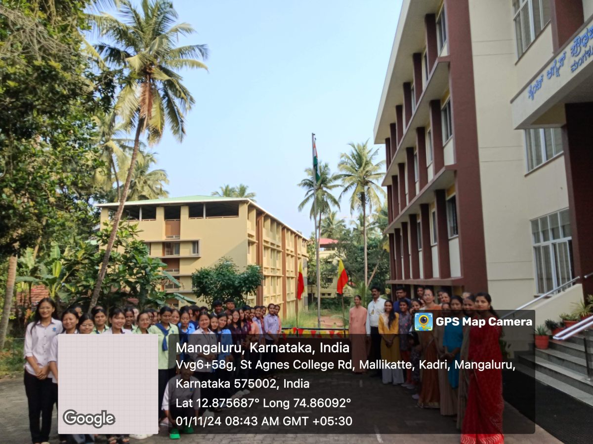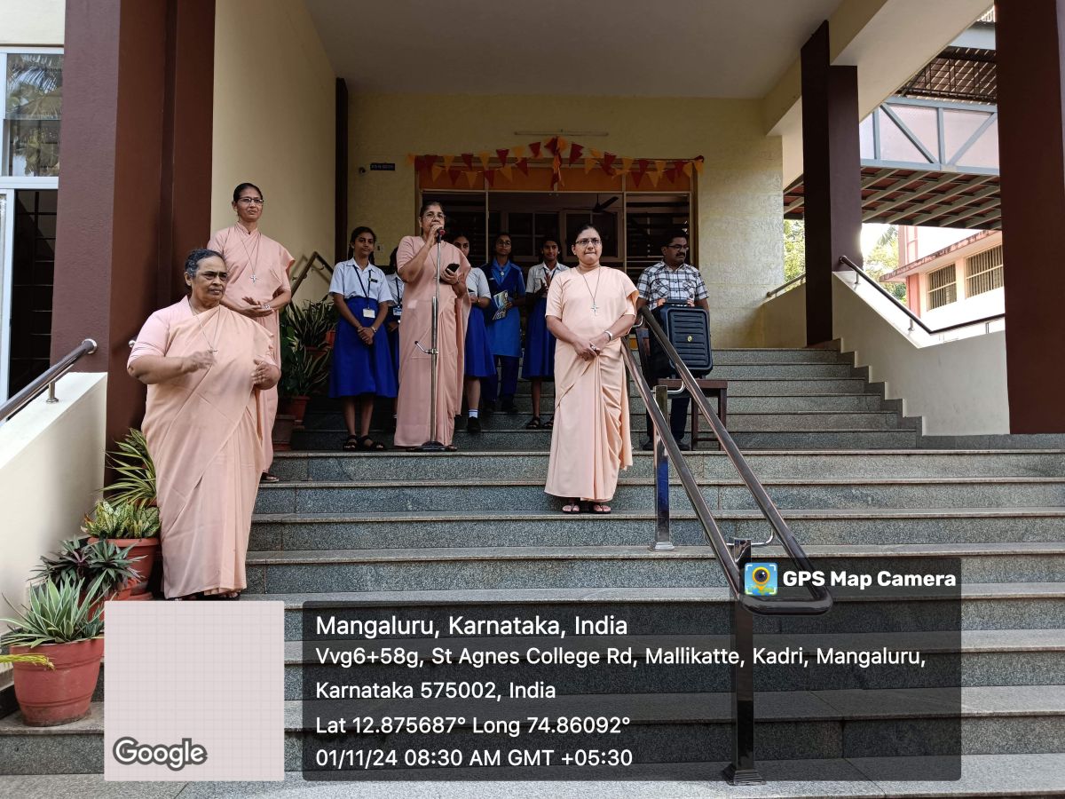 On 01-11-2024, a program was held with the participation of teaching and non-teaching staff and students of St. Agnes Group of Educational Institutions, Mangalore. The program, which began with a welcome, flag hoisting, and a prayer for the national anthem, featured songs such as Udayavagalai Namma Cheluva Kannada Nadu, Barisu Kannada Dindimava, Hachhevu Kannada Da Deepa, Vishwa Vinuthana Vidyachetana, and Huttidire Kannada Nadali Huttabeeku…, sung by the students. On this occasion, a resolution was made to preserve, cultivate and spread the Kannada language in the presence of all those present. The high school HM Sister M Gloria AC, participated as the chief guest and explained the importance of Kannada.