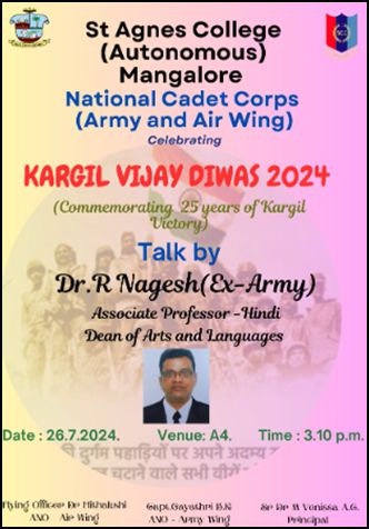 To mark the 25th Anniversary of Victory in ‘Operation Vijay’, the Kargil War- National Cadet Corps (NCC) of St Agnes College(Autonomous), Mangaluru celebrated this victorious day in St Agnes College, which was held in the A4.This day is dedicated to honour the bravery and sacrifice of the Indian Armed Forces, who fought valiantly to reclaim territory in the Kargil district of Jammu and Kashmir. Dr R Nagesh, Ex-Serviceman, HOD, Department of Arts & Humanities was the Chief Guest on this occasion. The chief guest during his interactive session enlightened the students about his days of service, he also stressed on the resilience and valour of men is the cause for the celebration of KargilDiwas. The winners of the digital poster making competition were felicitated by the chief guest. Lt Gayathri B.K-ANO, Army Wing, Dr Hithakshi Anand of Air Wing were faculty incharge of the programme and Ms. Divya, Asst Professor, Psychology department was also present. 62 cadets were part of this programme.