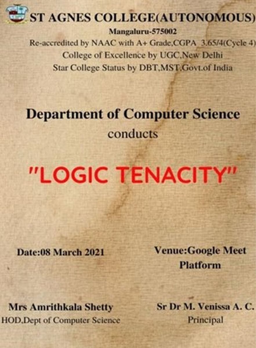 During the lockdown period, the Department of Computer Science, St Agnes College (Autonomous), Mangaluru organized Logic Tenacity on 8 March 2021. The students were asked to find the errors in the program and get the desired output. Time duration was 20 minutes. Nine students participated in this competition.