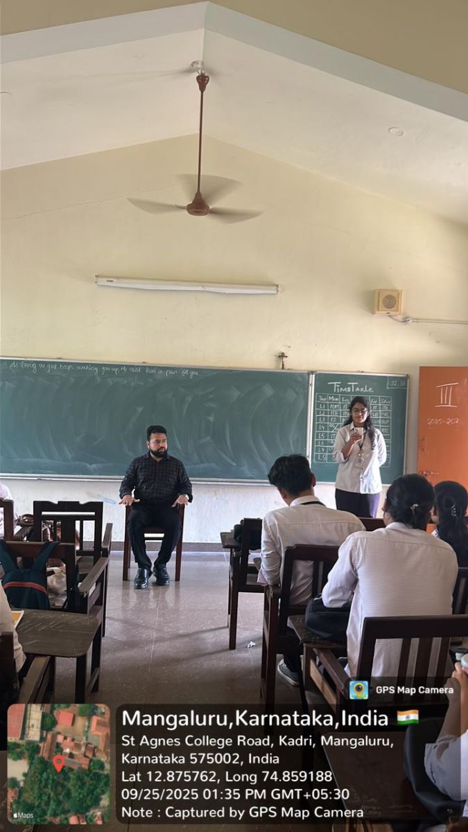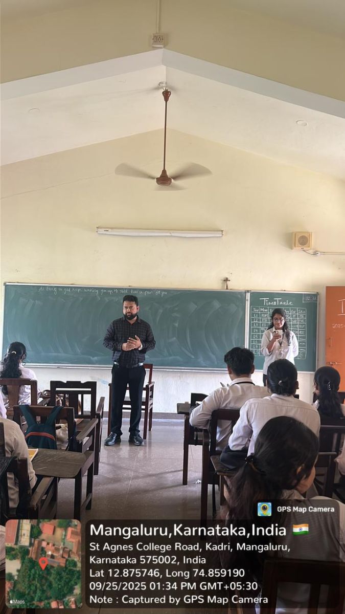 The Department of Business Organization organized a workshop on Logical Reasoning and Analytical Ability on 25 September 2025. The resource person for the session was Mr. Abhilash Kshatriya, CEO of WIN Foundation, Head of Siddhanth Education, Assistant Professor at NMAMIT, and Founder of Abhijnya Education. The program began with Ms. Carol Lancia Rodrigues introducing the guest speaker. Ms. Kushi Shetty then welcomed Mr. Kshatriya with a floral bouquet.