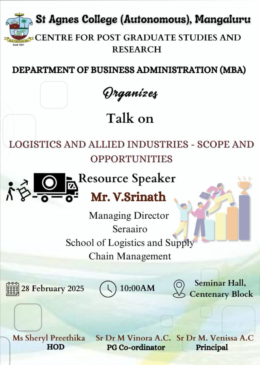 The Centre for Postgraduate Studies and Research, St. Agnes College (Autonomous), Mangalore, organized an insightful guest lecture on “Logistics and Allied Industries – Scope and Opportunities” on February 28, 2025, at the Seminar Hall, Centenary Block. Tailored for MBA and M.Com students, the session aimed to provide an in-depth understanding of the logistics and supply chain sector, a key driver of India’s economic growth.