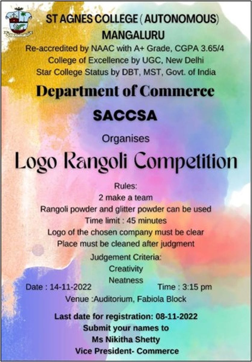 The Logo Rangoli Competition was held on 14 November 2022, at St Agnes College (Autonomous), Mangaluru in the old Auditorium. This competition was organized by the Department of Commerce to showcase the creativity and talent of students. The participants created unique and stunning logo rangolis using their creative skills. The rangolis were judged on their creativity, color combination, and neatness.