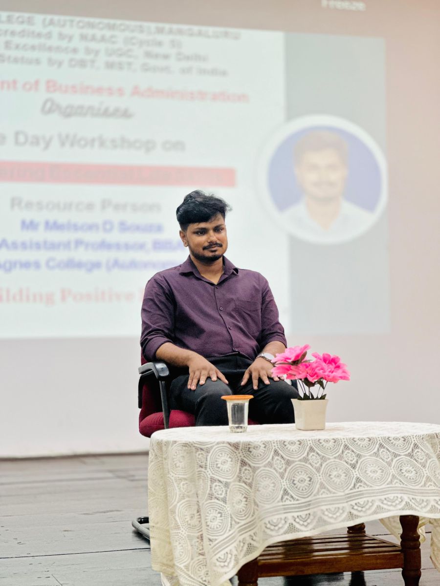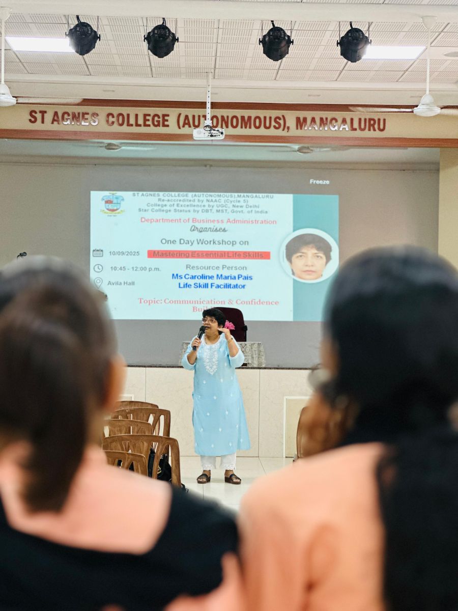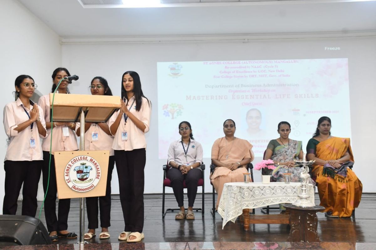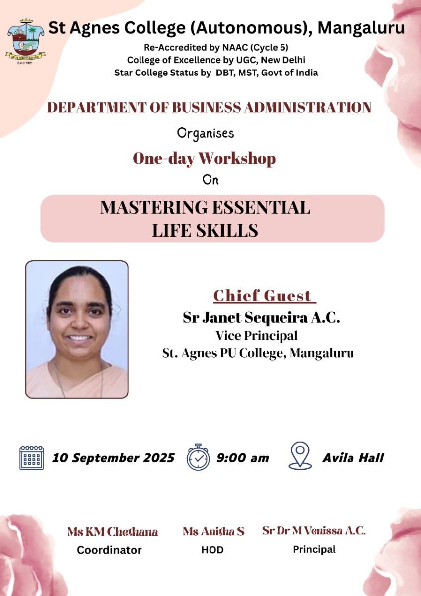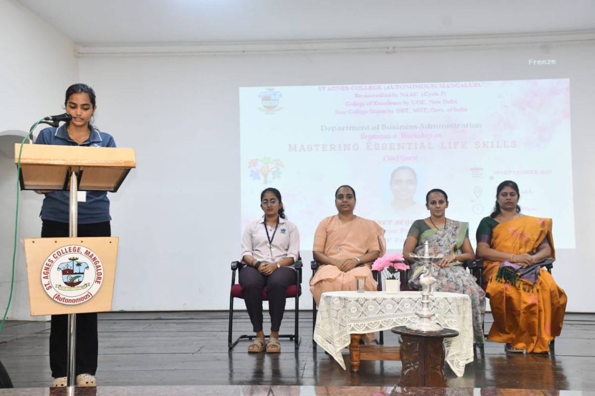 The inaugural programme began with a prayer song, followed by a welcome address delivered by Ms. Kushi Shetty. The Chief Guest, Sr. Janet Sequeira, Vice Principal of St. Agnes PU College, inspired the gathering by stressing the importance of life skills such as communication, interpersonal skills, decision-making, problem-solving, creative thinking, and coping with stress and emotions. She emphasized that these life skills collectively empower individuals to effectively manage personal and social challenges, thereby promoting overall well-being and success. Ms. Faaiza Faizal, III BBA presented an overview of the workshop, and Ms. Sannidhi S Shettyproposed the vote of thanks