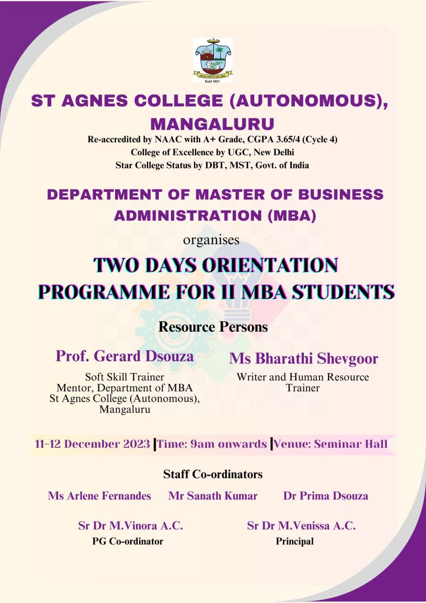The formal program commenced with a prayer song, seeking divine blessings for the success of the orientation. Distinguished guests and speakers present during the event included Sr Dr Venissa A.C., Principal, Sr Carmel Rita A.C., Administrator, Sr Clara A.C., Vice Principal, Sr Dr M. Vinora A.C., PG Coordinator, Prof. Gerard Dsouza, Soft Skill Trainer and Mentor, Department of MBA, and Ms Bharathi Shevgoor, Writer and Human Resource Trainer.