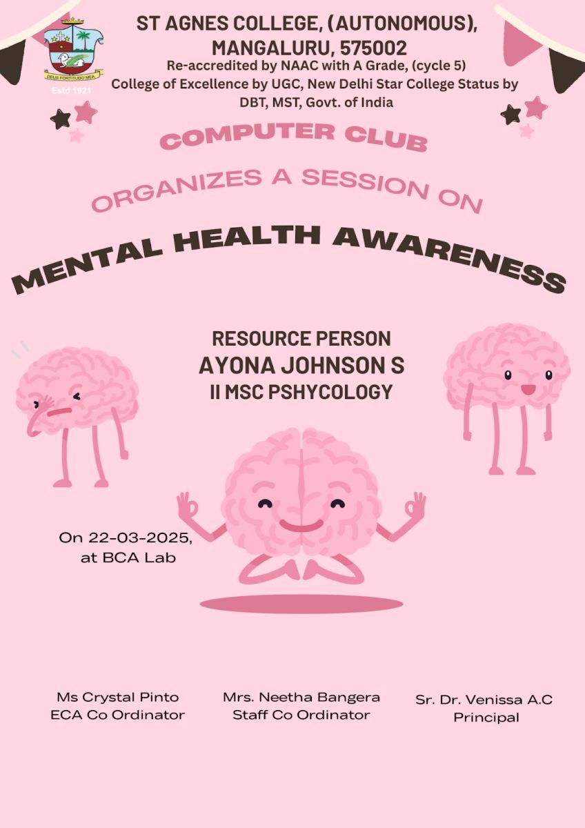 On 22-03-2025, Computer club organized a session on Mental Health Awareness at BCA Lab. The session was conducted by the Resource person Ayona Johnson, II MSc Psycology Student of St Agnes College (Autonomous). The session focused on the importance of mental well-being, recognizing distress signs, and coping strategies. The event encouraged open discussions and interactive activities Session Highlights