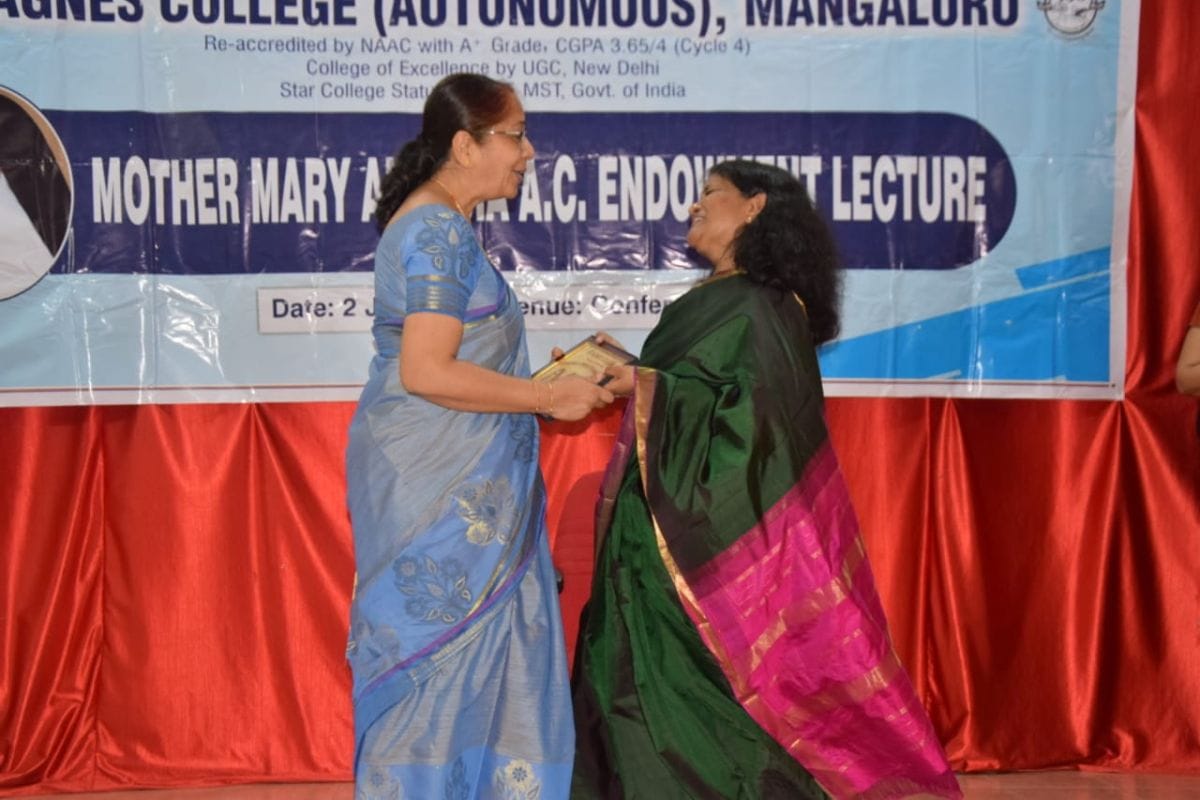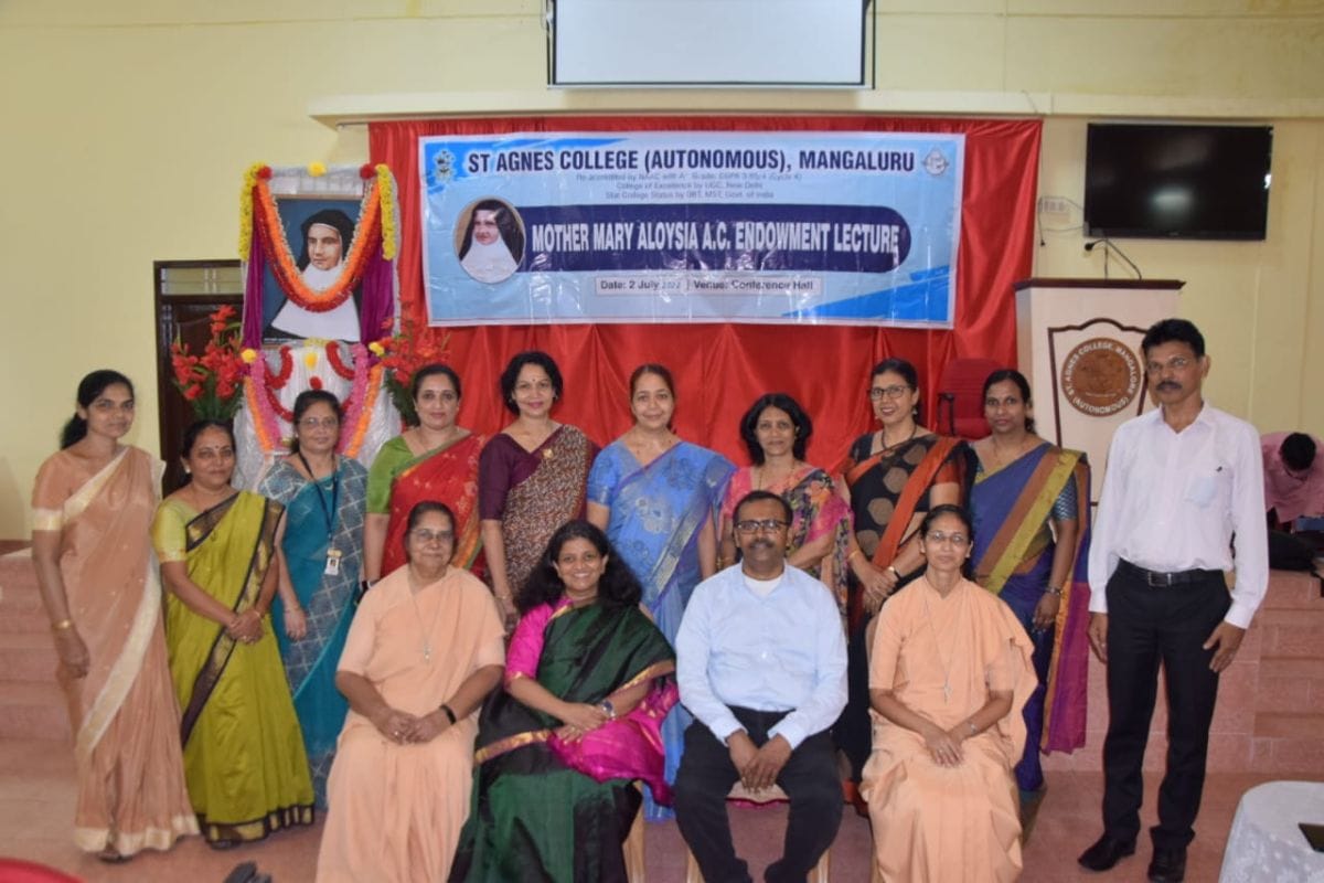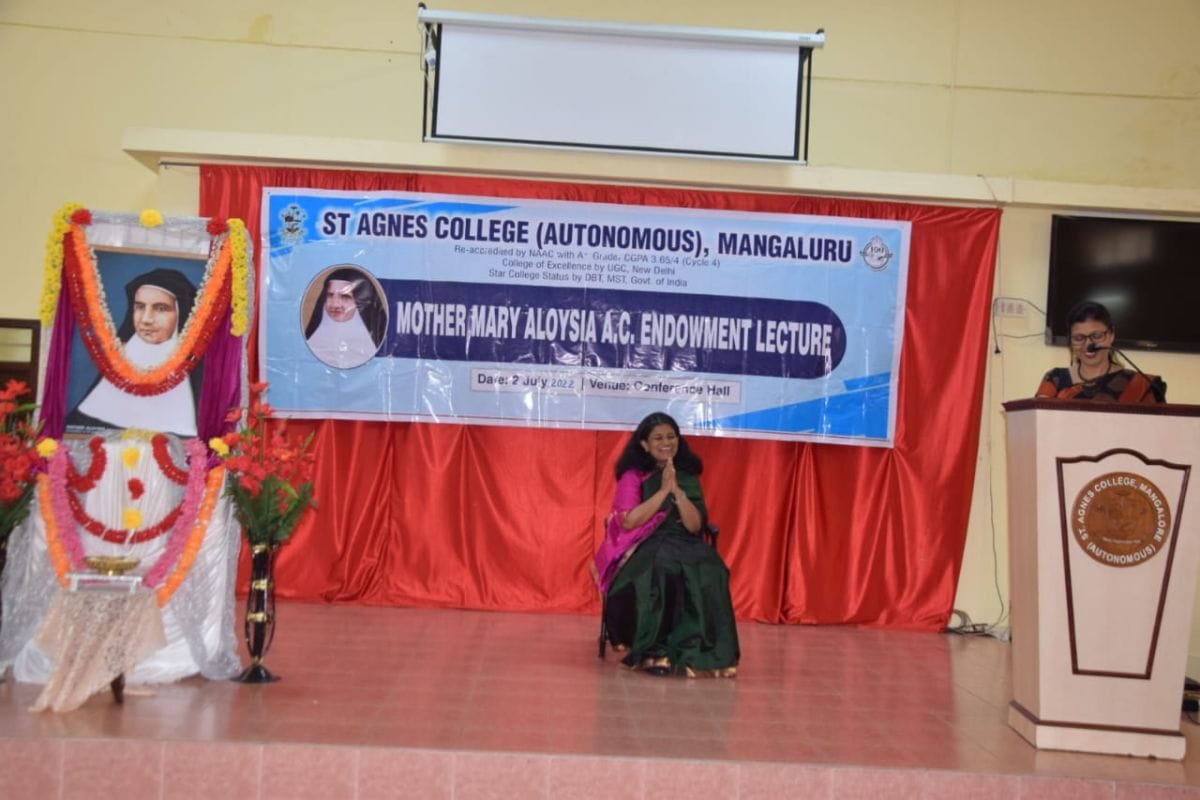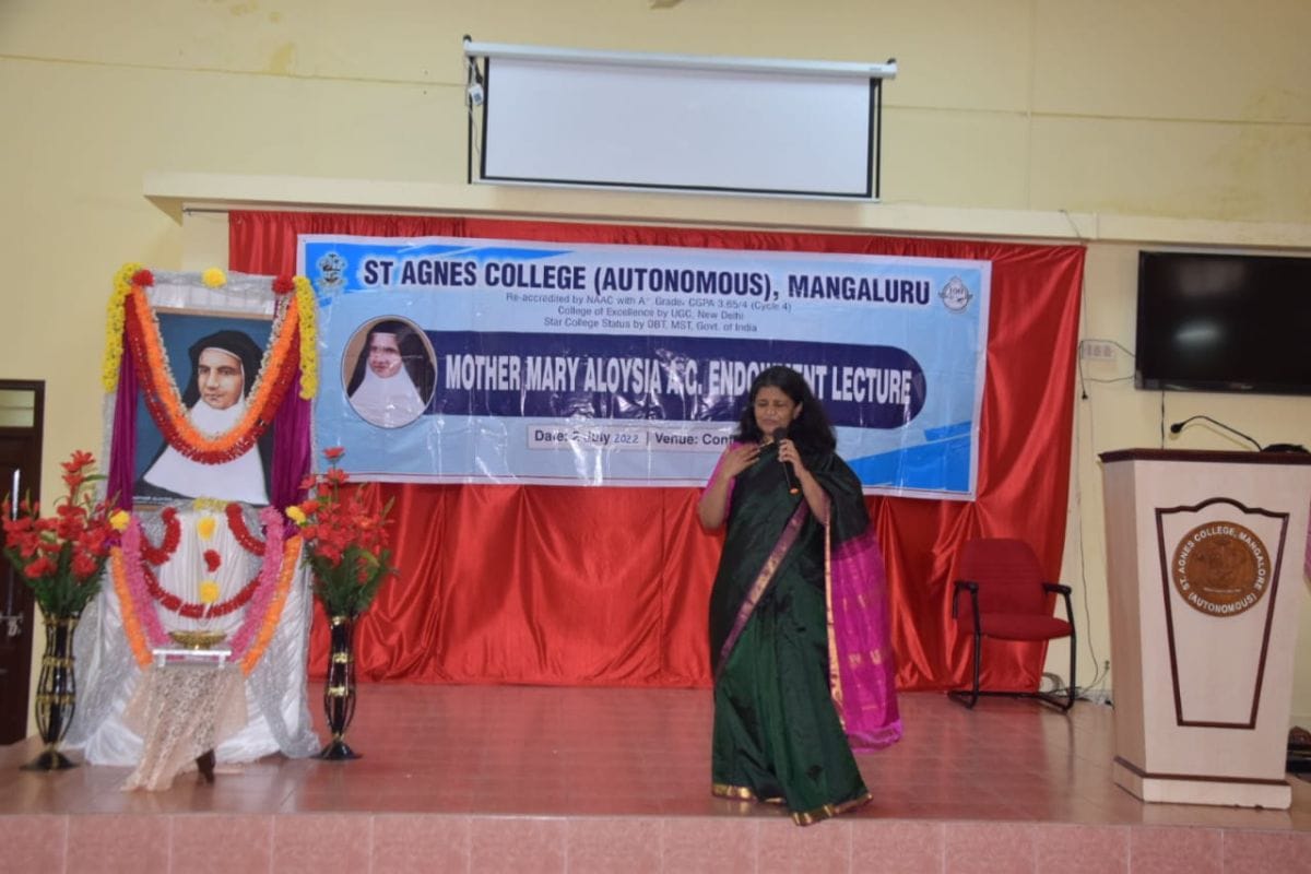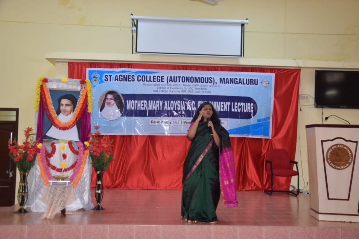 On 2 July 2022, the Eighth Mother Mary Aloysia Endowment lecture was organised at the Conference Hall by the IQAC of St Agnes College (Autonomous), Mangaluru. The day also marked the 102nd establishment day. The resource person for the lecture was Jacintha Jayachandran, Social Entrepreneur, Leadership & Life coach, Strategic Corporate Advisor, Writer & Public Speaker, Bangalore. In her topic ‘Leading from the front for an equal future’ she emphasized that equality is a human right and supporting special needs in a person’s life is equity. The greatest equalizer is education itself where women are given opportunities to have it. She stressed that inner happiness for a woman is most important than the outer world and for inner peace there is no need for validation and approval from people around you. But at times she felt that women did concentrate on the outer world first. She highlighted on the three C’s, computer, communication and confidence which women should incorporate in their lives. She ended her motivational speech by highlighting on the fact that to create an equal family is the work of both men and women which will bring hope, education and employment in the society.