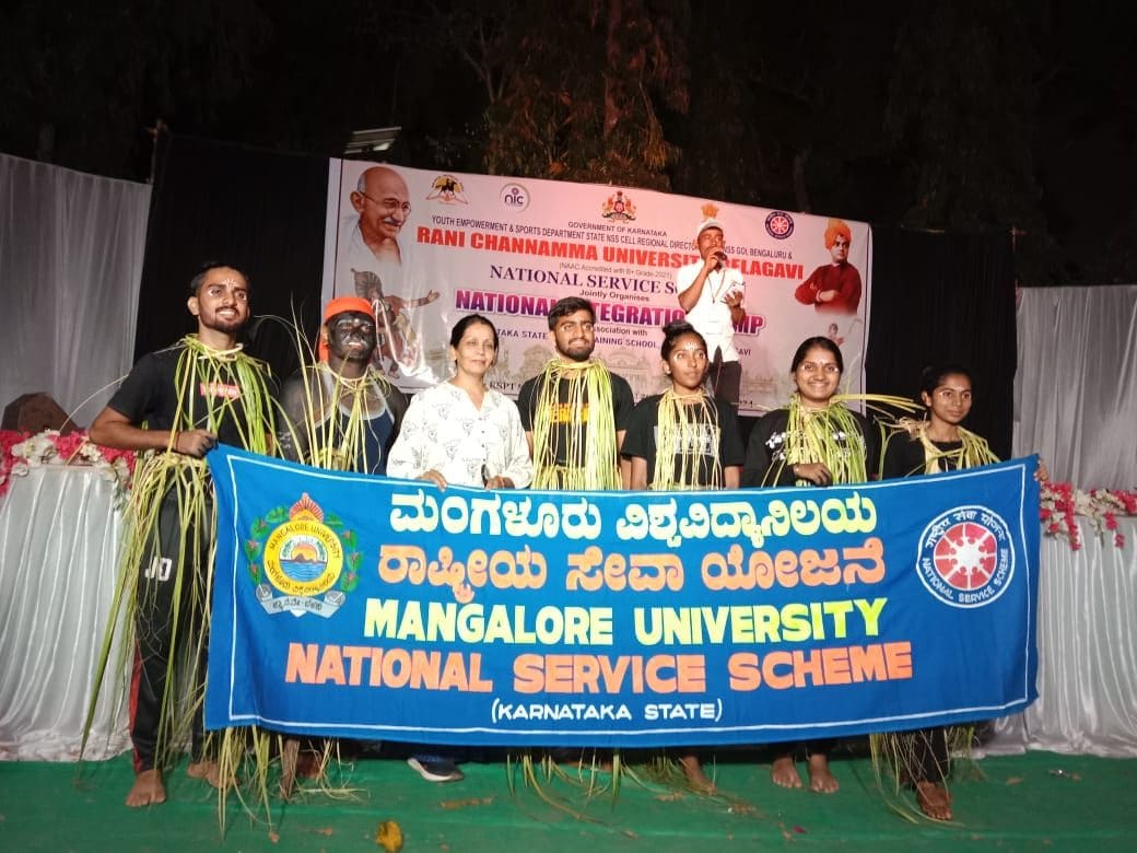 The National Integration Camp was held in Belgavi from 20th to 27th February 2024. Our volunteers, Dan Vijay Charles (I B.Com) and Hriswi (II BCA), along with four other volunteers, represented Mangaluru University. The seven-day camp saw participation from seven states and 18 universities across Karnataka. The primary aim of the camp was to unite different cultures and people in a single environment. Numerous competitions were held to provide an opportunity for participants to showcase their cultural heritage.
