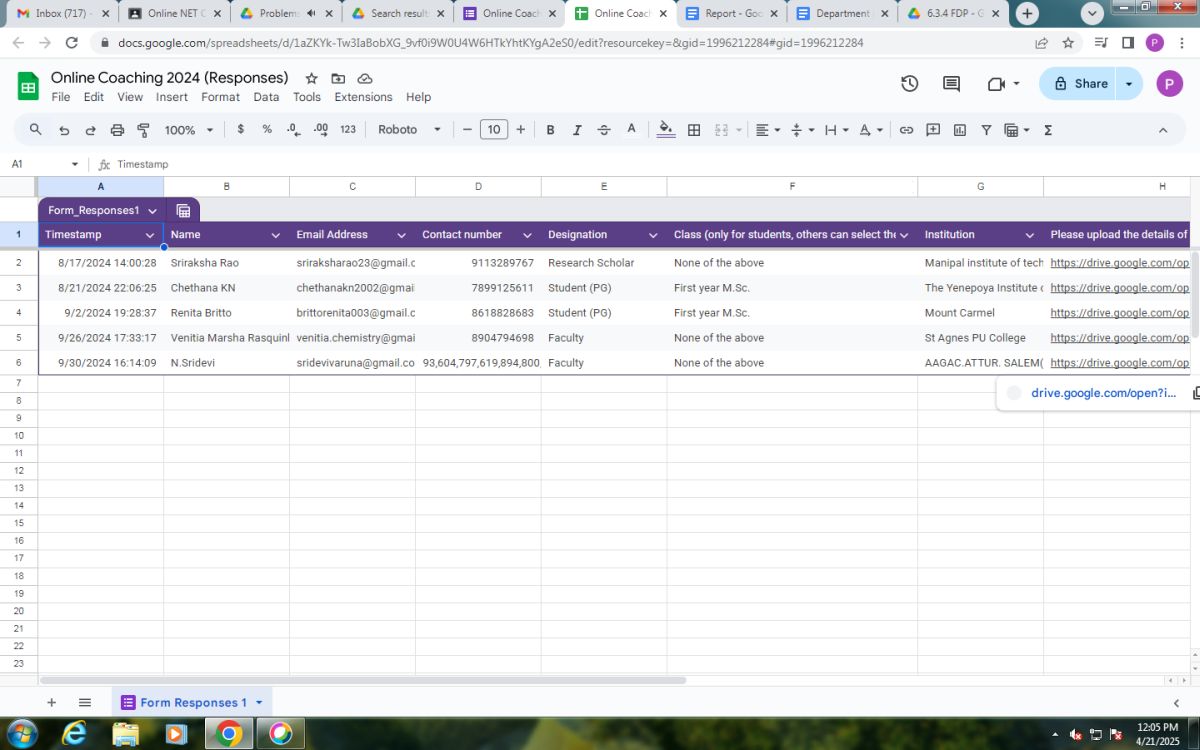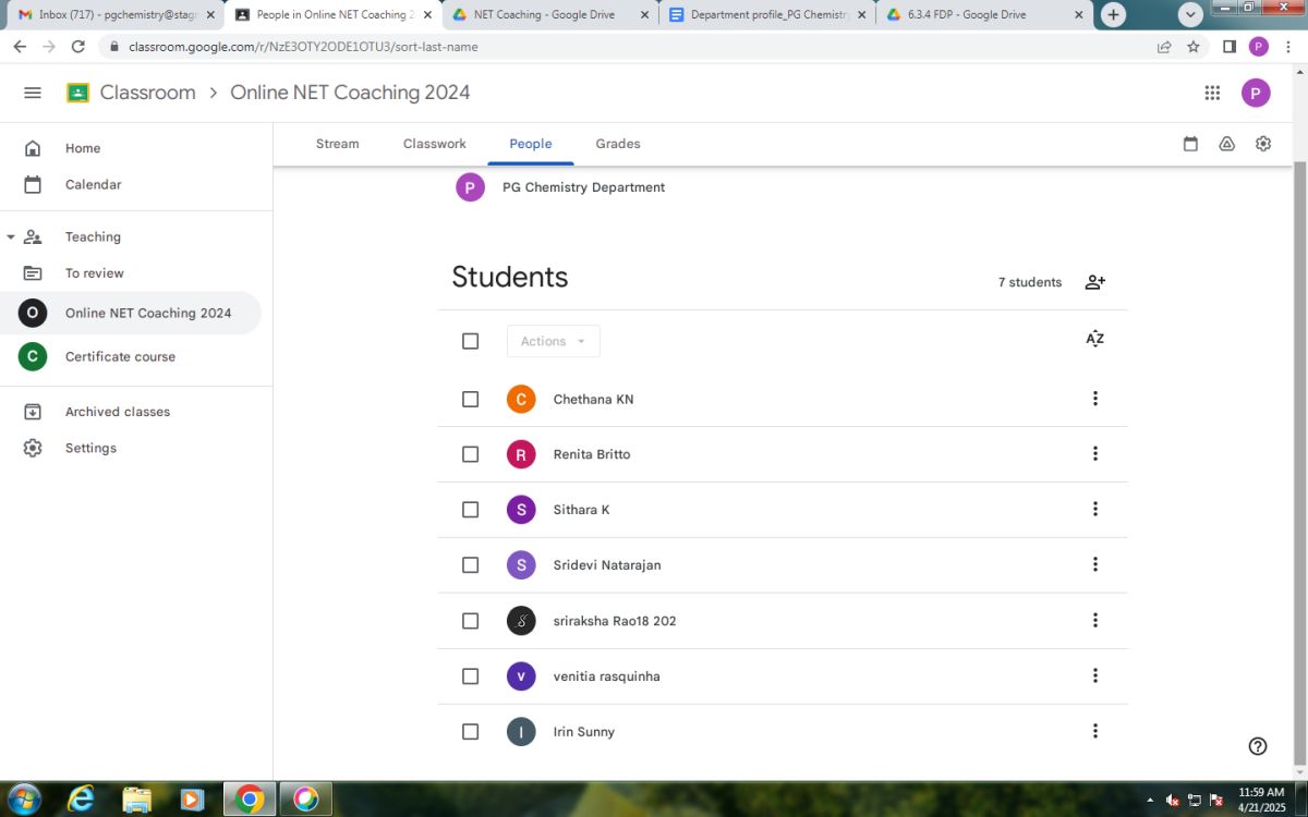 The PG Department of Chemistry, St Agnes College (Autonomous), Mangaluru organized an Online NET/SET/GATE Coaching in Chemical Sciences from September to November 2024. This coaching was offered online and covered a range of topics like Coordination Chemistry, Pericyclic Chemistry, Main Group elements, Organic Spectroscopy, Chemical Kinetics and many other topics.