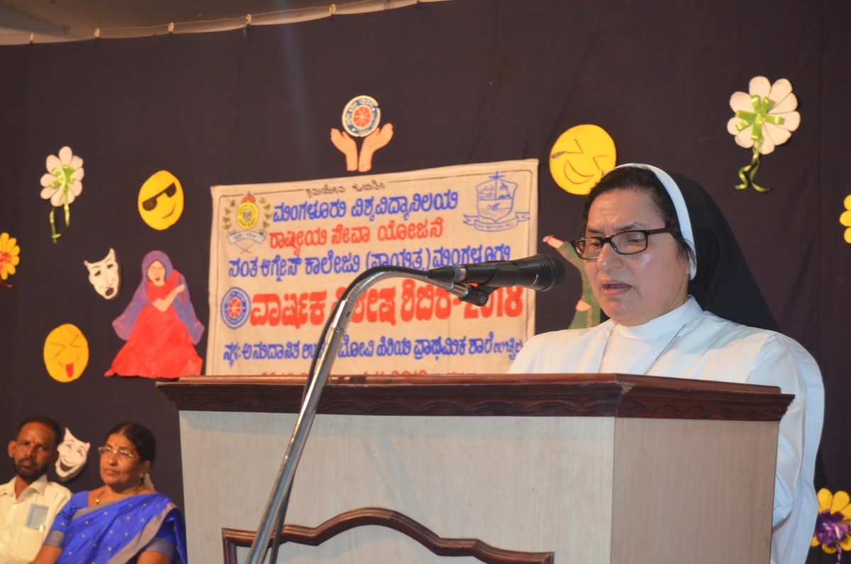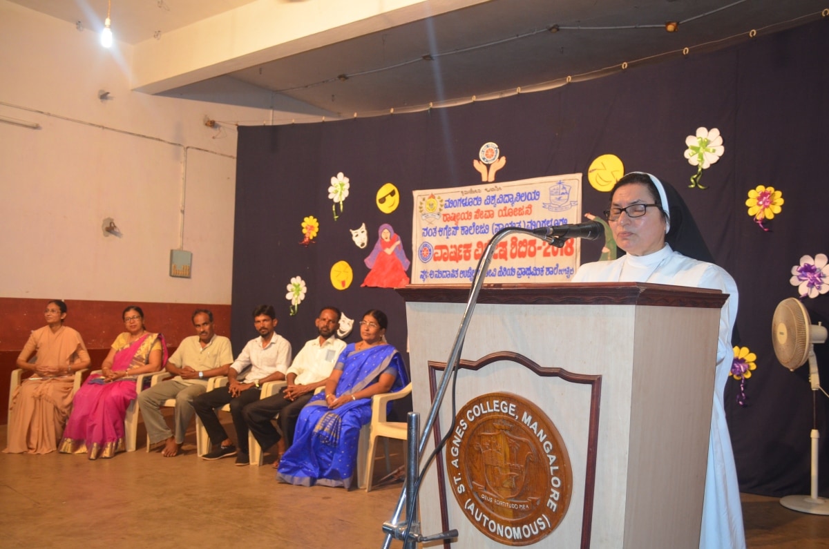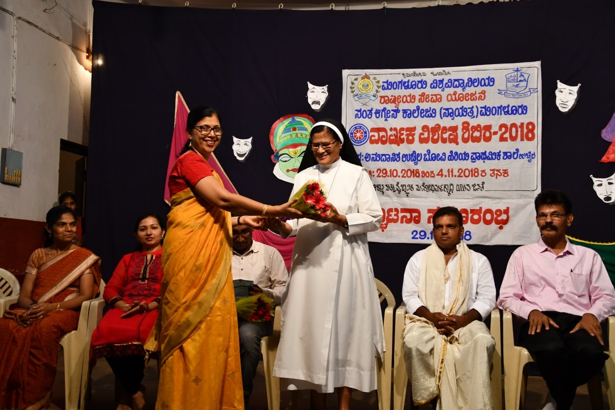 Mr Devadas C. Uchil, Correspondent of Uchila Bovi Educational Institutions inaugurated the camp by lighting the lamp and assured his wholehearted co-operation for the success of the camp. Mr Charles Pais, Registrar Evaluation, St Agnes College (Autonomous) spoke on the occasion, shared his experiences as a former NSS Programme Officer, motivated the volunteers to actively participate in the programmes, appreciated the support extended by the Parents, and applauded the enthusiasm shown and co-operation extended by the Management of Uchila Bovi Educational Institutions. Mrs. Shanthi Nazareth, Student Welfare Officer, congratulated the volunteers, emphasized that the need of the hour – Service, and wished them success in life. Sr Dr Maria Roopa A.C., Joint Secretary of St Agnes Institutions, invited the volunteers to grab the opportunity and acquire life skills needed to lead a happy life. She highlighted the significance of Sacrifice and Service in one’s life and called upon the volunteers to bring smile on the faces of less fortunate ones by their exemplary role as NSS volunteers.