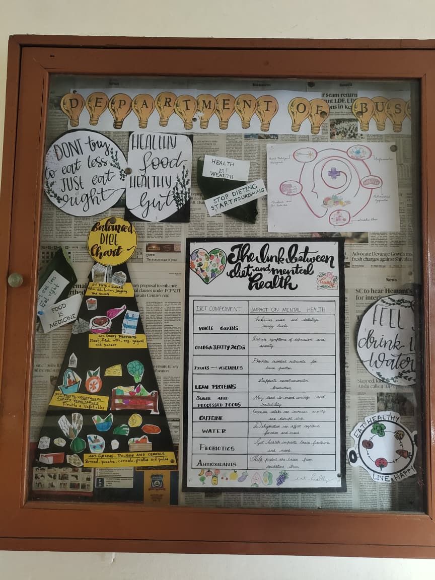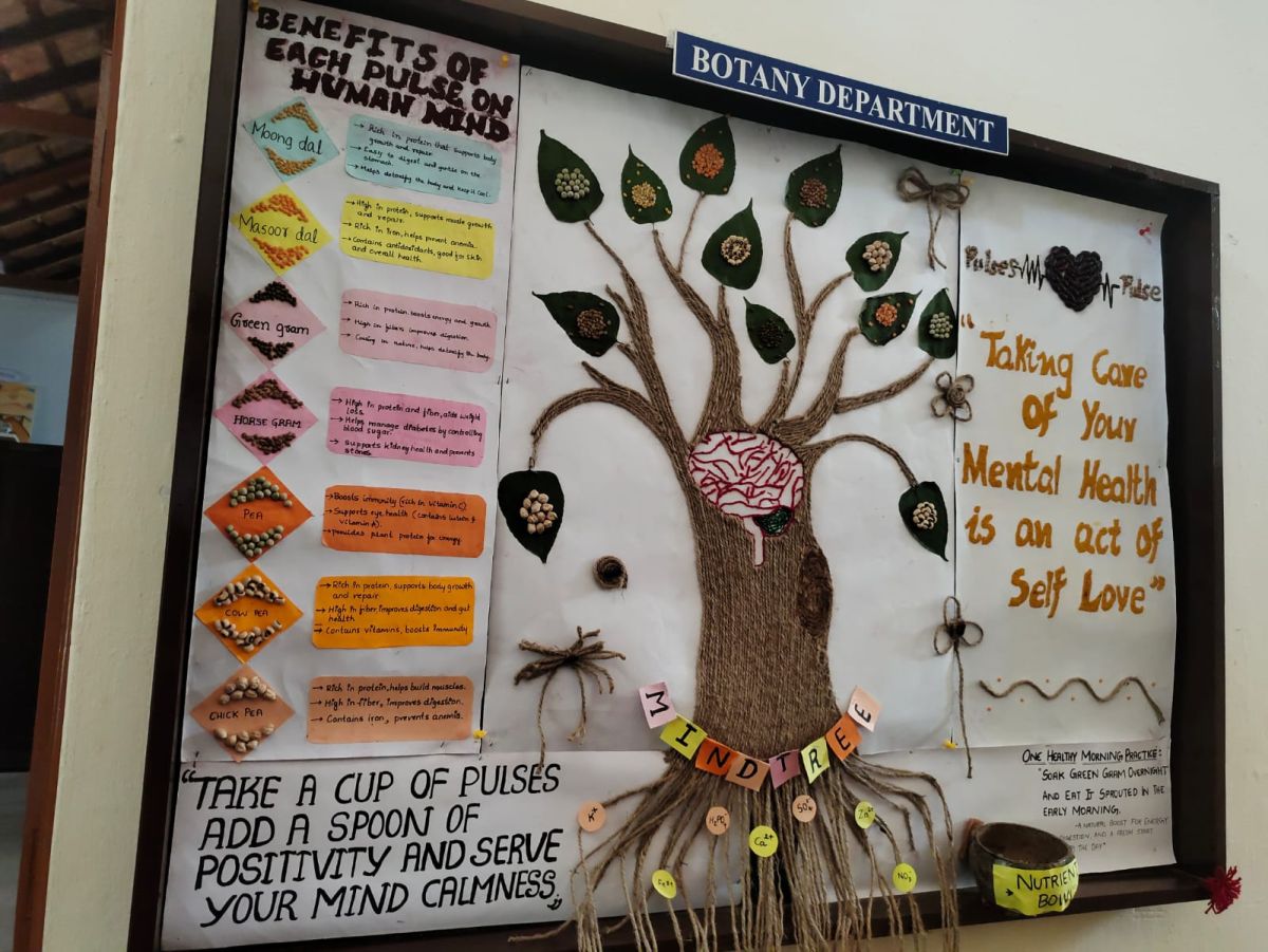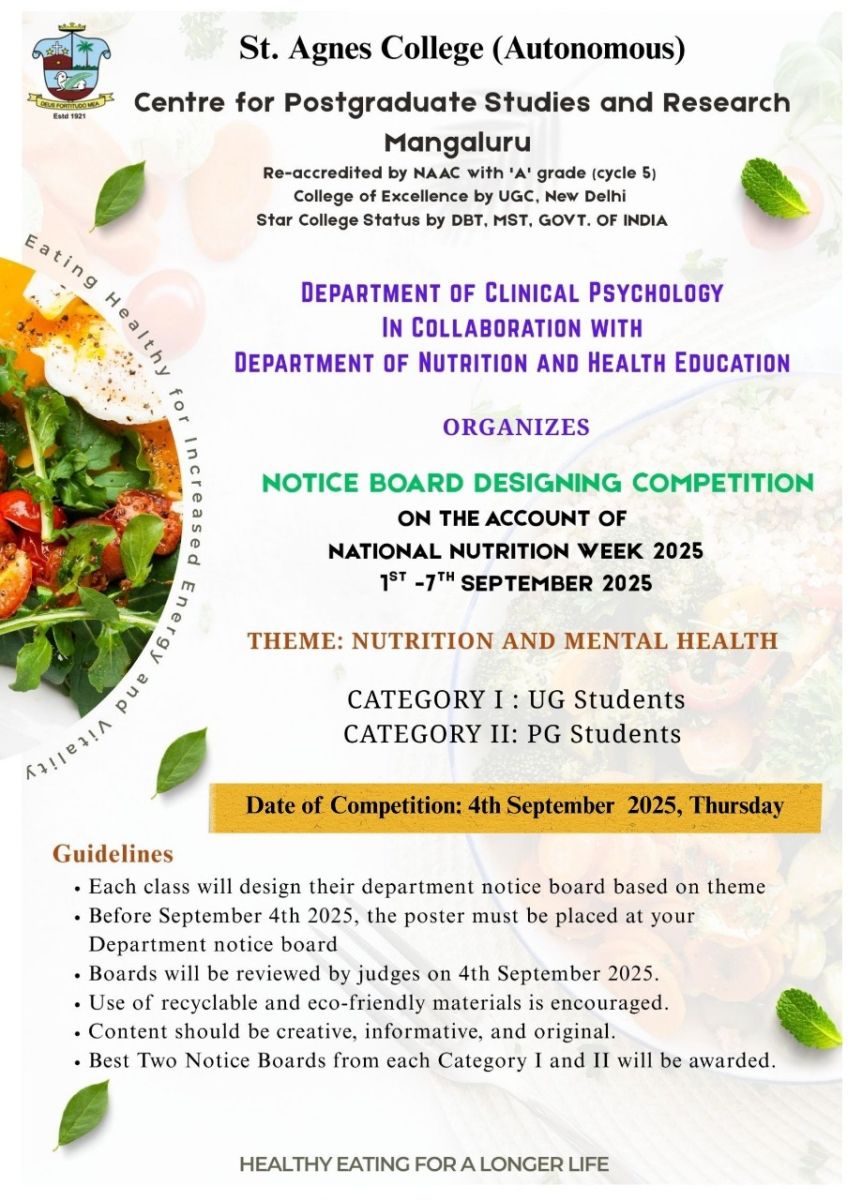 On National Nutrition Week 2025 (1st–7th September), the Department of Clinical Psychology, in collaboration with the Department of Nutrition and Health Education, organized a Notice Board Designing Competition with the theme “Nutrition and Mental Health.” The event aimed to raise awareness among students about the connection between nutrition and mental well-being while encouraging creativity and interdepartmental participation. Students from Microbiology, Mathematics, Botany, Psychology, and Chemistry departments took part in the competition. The entries were evaluated on creativity, theme relevance, accuracy of content, and visual appeal. The mathematics department (UG) won the 1st prize, the Botany department (UG) secured the 2nd prize in UG category and the Chemistry department (PG) secured 1st prize in PG category. The competition provided students with opportunities to enhance their knowledge of nutrition and mental health, develop creative and research skills, collaborate across departments, and gain confidence through public recognition. Overall, the event successfully combined education, creativity, and health awareness, making it a meaningful initiative for students during National Nutrition Week 2025.