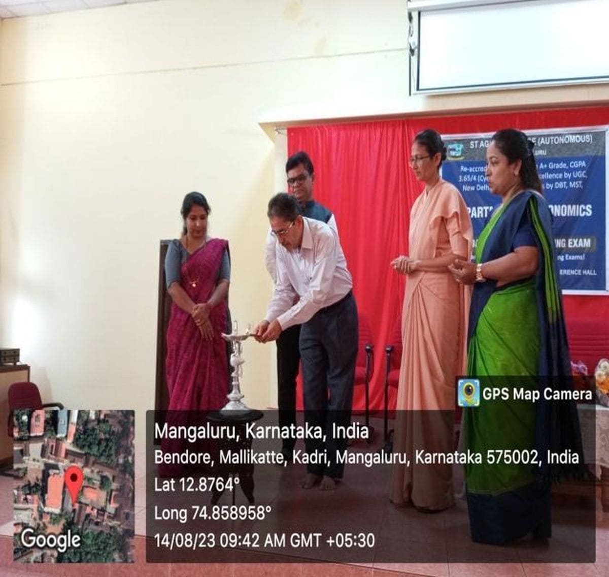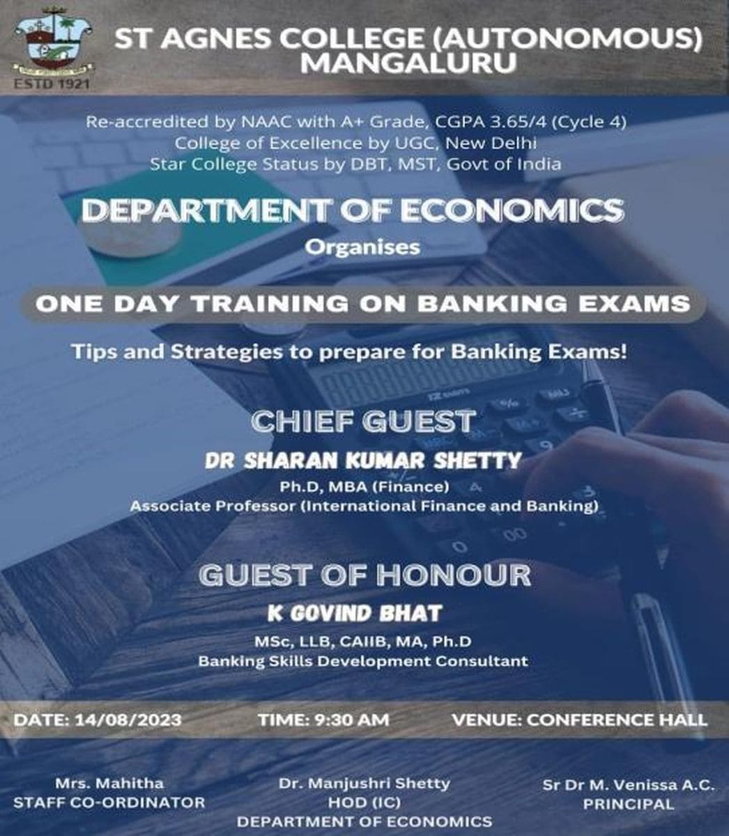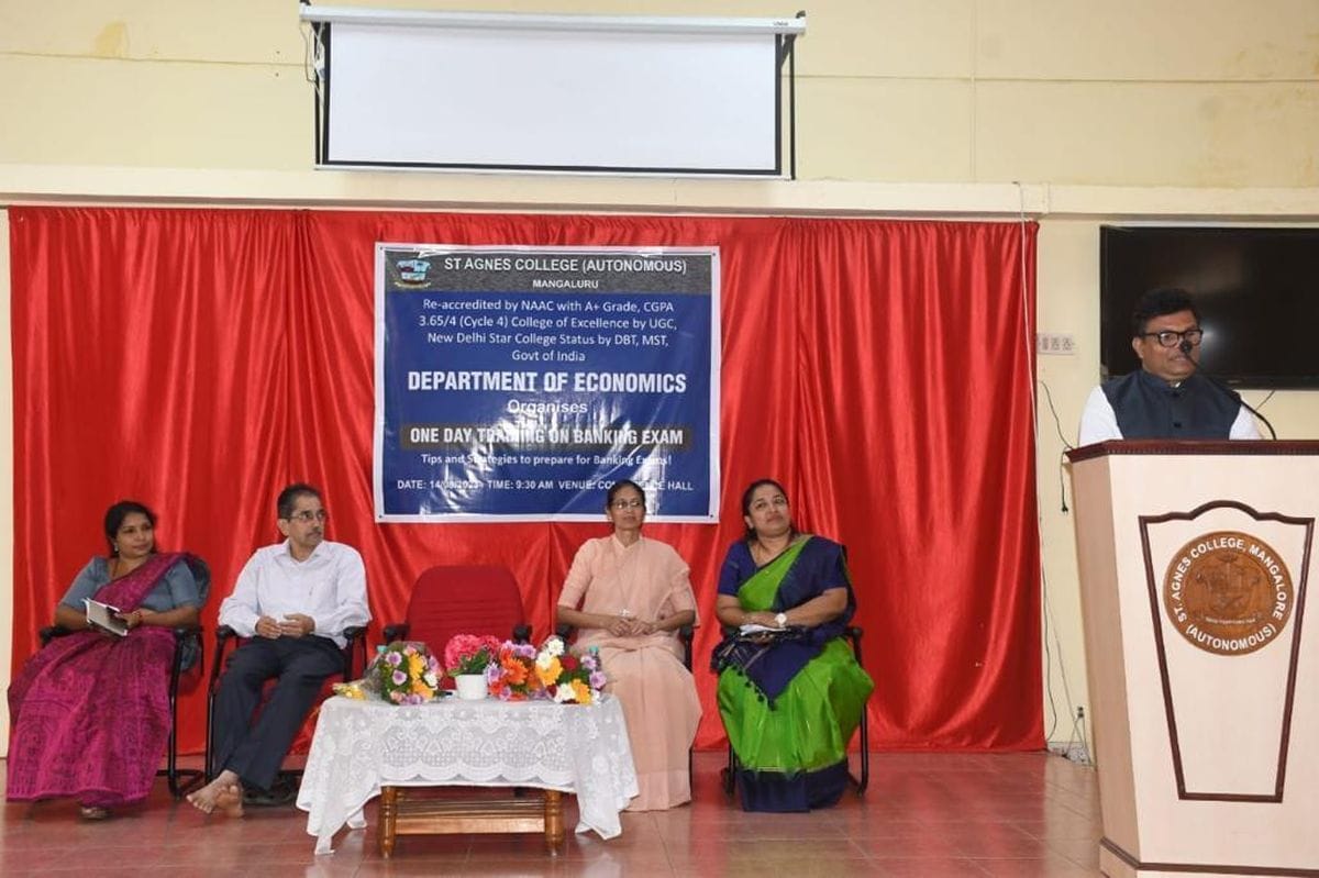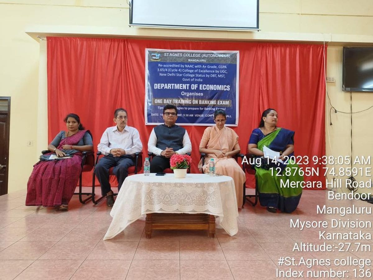 The Department of Economics, St Agnes College (Autonomous), Mangaluru organised a ‘one day training programme on banking exams’ for the students of the College. It was held on 14 August 2023 at the conference hall from 9:30 am to 4:00 pm. The Chief Guest of the session was Dr Sharan Kumar Shetty, Associate Professor MBA (finance). The event was also graced by Mr K Govind Bhat, Guest of Honour and Sr Dr M Venissa A.C., the Principal. The event began with invoking God’s presence followed by lighting of lamp by the dignitaries on the dais. Welcome address and introduction of the programme was presented by Dr Manjushree Shetty, Head, Department of Economics. The chief guest addressed the gathering on the benefits of this program and congratulated the department of economics for taking the initiative of conducting such an event. The Guest of Honour Mr K Govind Bhat highlighted the scope of job opportunities in the banking sector. Sr Dr M Venissa A.C., the Principal appreciated the efforts of the Department of Economics for conducting an informative session and advised the students to make the best use of the session. Mrs Mahitha, Assistant Professor, Department of Economics delivered the vote of thanks.