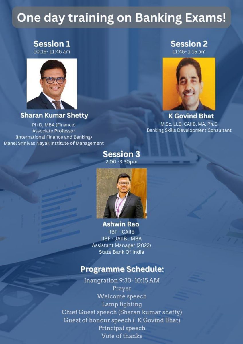 First Session scheduled from 10:15 am to 11:45 am was conducted by Dr Sharan Kumar Shetty, Associate Professor MBA (finance), Manel Srinivas Nayak Institute of Management. He started with the discussion on various banking exams and their pattern. It was followed by solving some previous year questions. It was an interactive session and he asked the students questions and kept them engaged. Dr Sharan shared various tips to follow while attempting the exam and highlighted the importance of practice. The session was informative and was thoroughly enjoyed by the student.