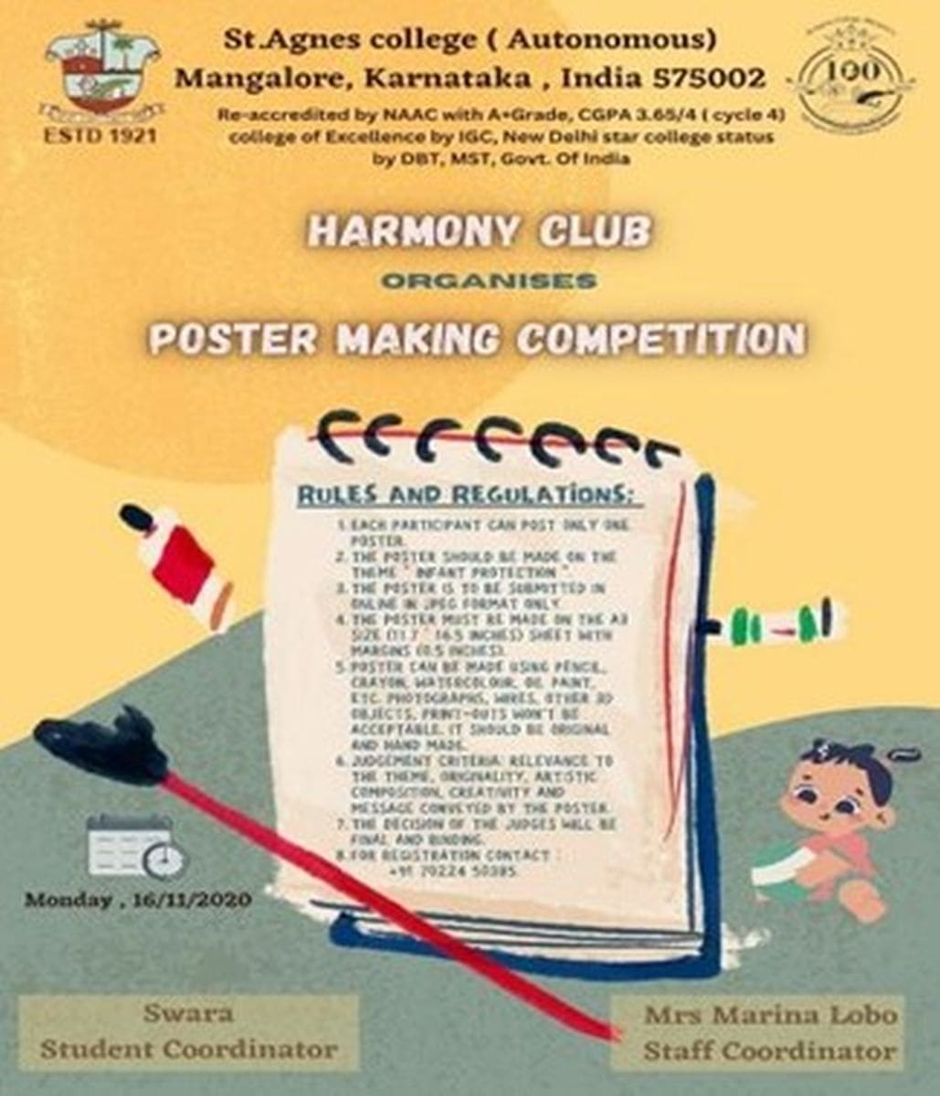 The Harmony Club, St Agnes College (Autonomous), Mangaluru conducted a Poster Competition for the students of the college on 16 November 2020. The theme of the competition was ‘Infant Protection’ and this theme was observed on 7 November 2020 throughout the world. 15 students participated in this competition.