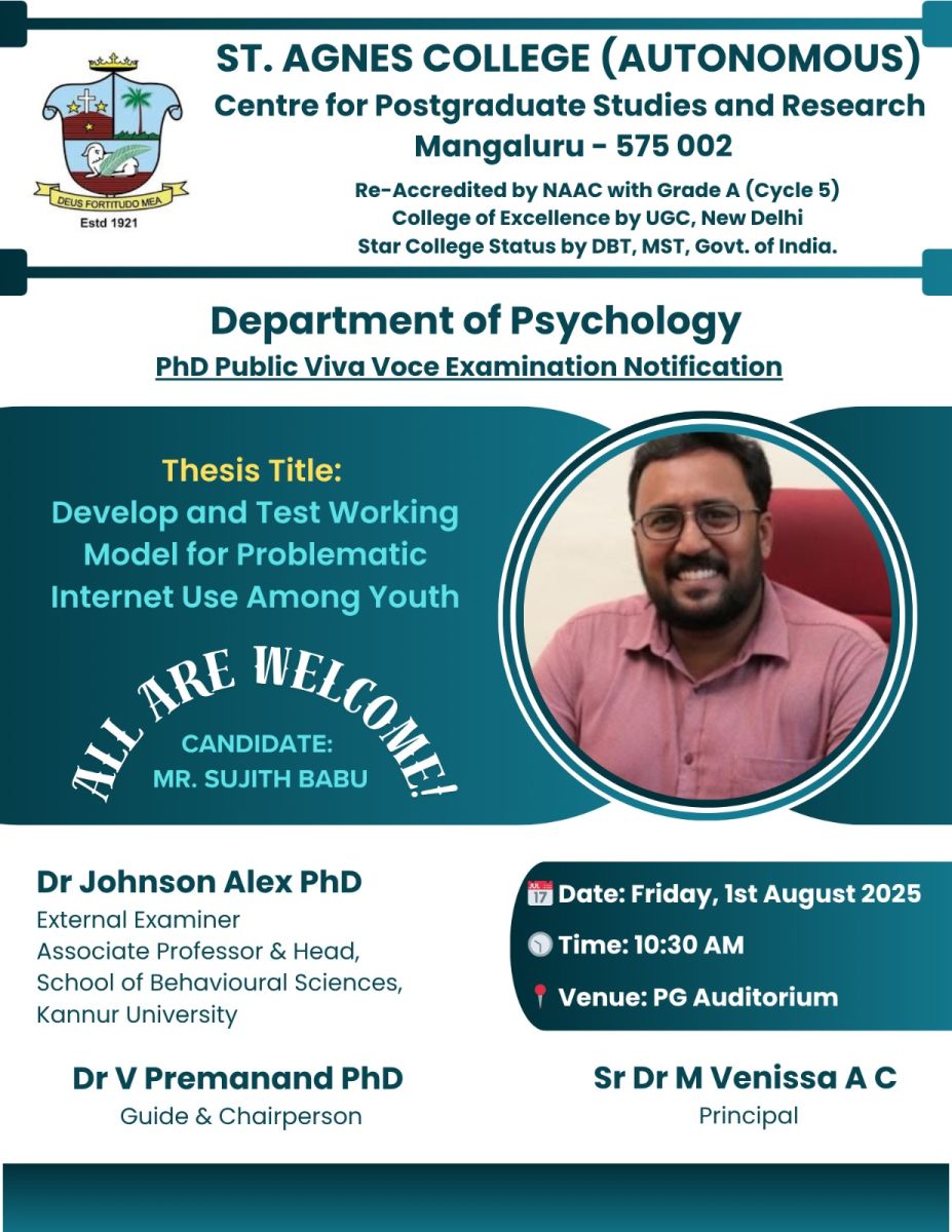 The St Agnes College (Autonomous), Centre for Postgraduate Studies and Research, Mangaluru, hosted the Open Public Viva Voce Examination of Mr. Sujith Babu on 1st August 2025 at the Postgraduate Auditorium. The event drew an audience of 93 participants, including faculty, research scholars, students, and guests.
