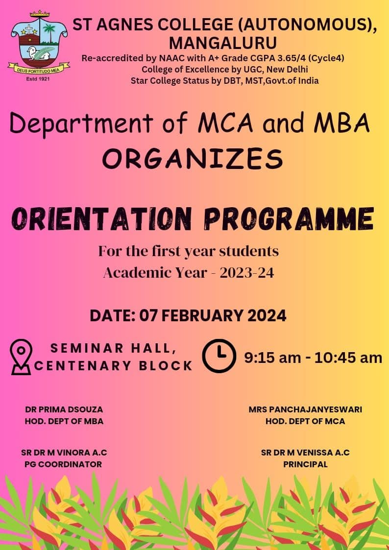 The inaugural orientation program for newly admitted MBA and MCA students at St Agnes College, Mangaluru, was a resounding success, characterized by warmth, enthusiasm, and a shared commitment to academic excellence and personal growth.