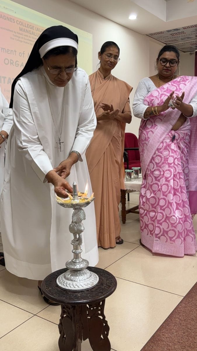 The atmosphere was further enlivened by an enthralling welcome dance performed by Anjana and her team, setting a vibrant tone for the day. Captivating visuals, including videos showcasing the college, campus, facilities, achievements, and various programs and sessions conducted by both the MBA and MCA departments over the years, provided the attendees with a glimpse into the rich tapestry of academic life at St Agnes College, followed by the lighting of the lamp, symbolizing the enlightenment of knowledge.
