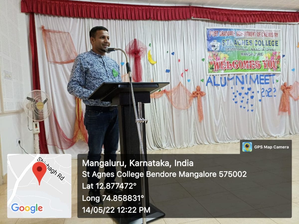 Some of the alumni shared their college memories as well as their experiences in the outside world after stepping out of the college. Mr Joel Quadros, Chemical Engineer, Corodex, Dubai from the first batch who passed out in the year 2012, presently working as a chemical engineer in Dubai was the first one to share the experience. He spoke about the challenges as well as learning they had as students being from the first batch. He acknowledged that it is because of the great support extended by the college they were able to do well. He also appreciated Dr Geetha Mable Pinto who had been the H.O.D. from the inception of M.Sc. Chemistry in the college until this year, for being a mother, teacher and back bone of all the initiatives of the students. He is also overwhelmed by the fact that the college keeps in contact with all the alumni. At the end he assured his support and assistance to the students who desire to work in Dubai after the completion of MSc.