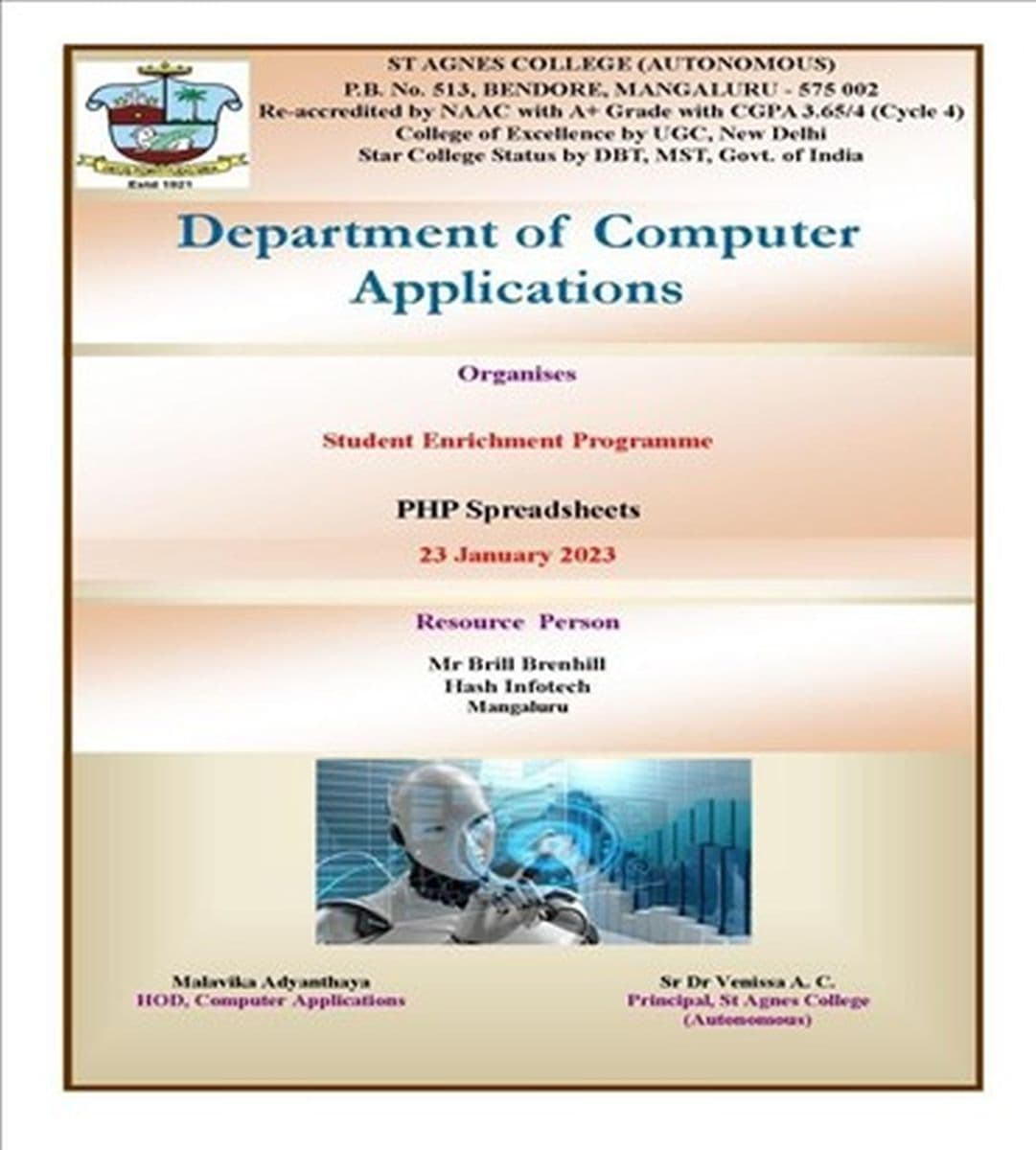 The Department of Computer Applications, St Agnes College (Autonomous), Mangaluru organised a technical student enrichment programme on PHP Spreadsheets for the students of BCA on 23 June 2023. Fifty students participated. The resource person was Mr. Brill Brenhill from Hash Infotech, Mangaluru.