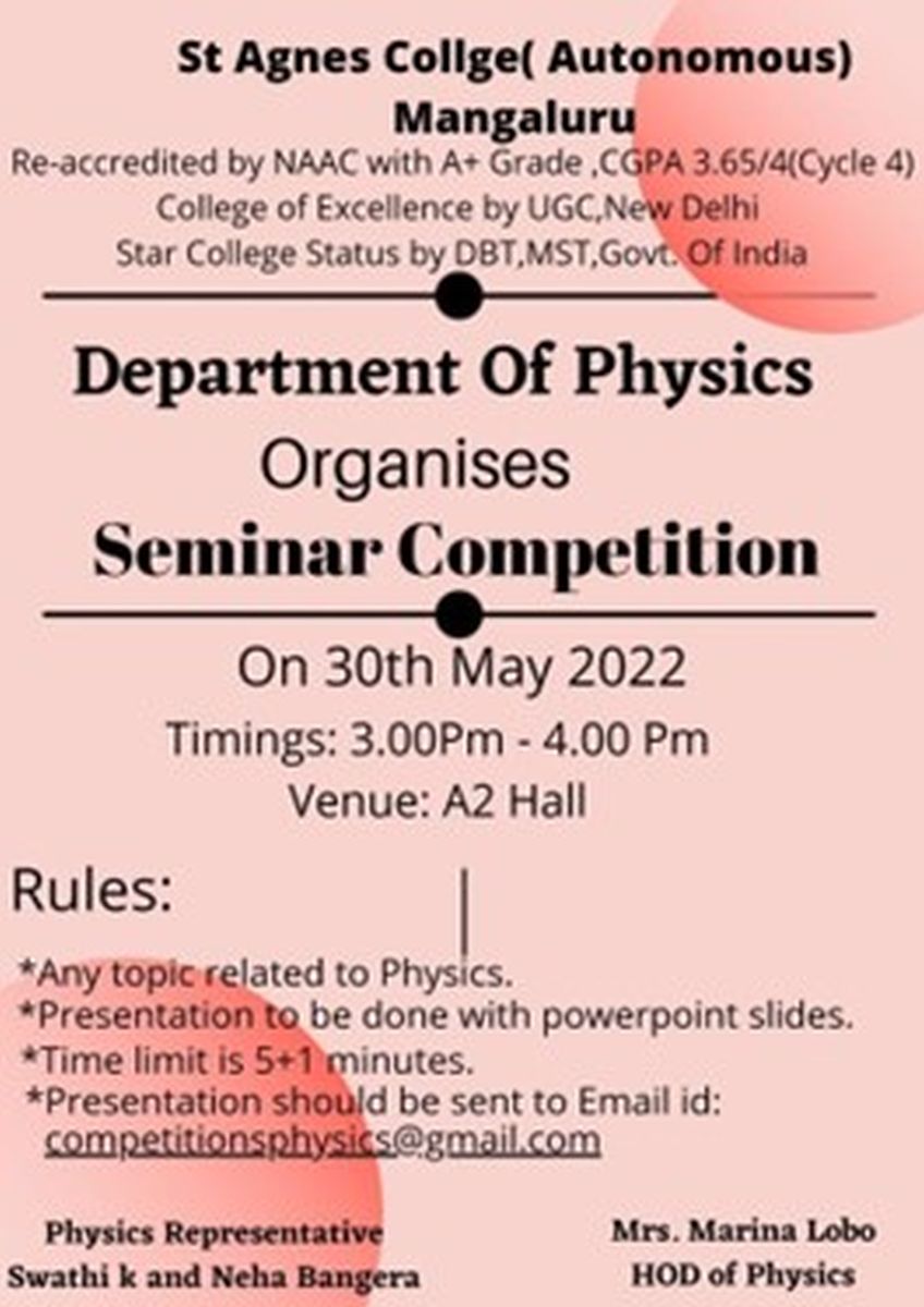 On 30 May 2022, the Department of Physics, St Agnes College (Autonomous), Mangaluru organized a seminar competition where 9 students actively participated, presenting modern physics topics which showcased the student’s enthusiasm and competitive spirit.