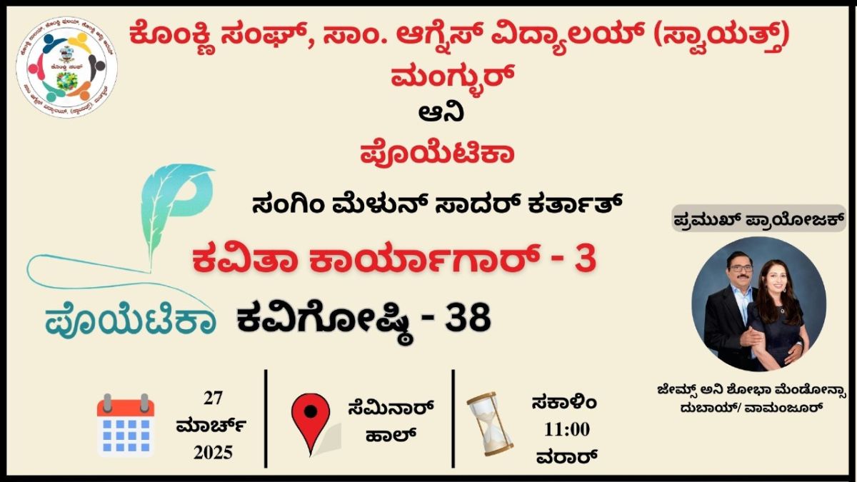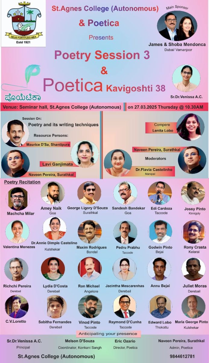 Poetica and Konkani Sangh, St. Agnes College (Autonomous), Mangaluru, jointly organized Poetica Session-3 & Poetica Kavigoshti 38 on March 27, 2025, to celebrate and promote Konkani literature and poetry. This program was brought to life with the generous support of Mr James and Mrs Shoba Mendonca.With their encouragement and sponsorship, Konkani Sangh was able to celebrate the rich tradition of Konkani poetry and provide a platform for the voices that express our shared culture.The event was inaugurated by Chief Guests Mr. Joachim Stany Alvares, President of the Karnataka Konkani Sahitya Academy, and Mr. Marcel D’Souza (Machcha Milar), a distinguished Konkani poet. In his address, Mr. Alvares commended Poetica and Konkani Sangh, St. Agnes College, for their dedicated efforts in nurturing Konkani literature and assured continued support from the Konkani Sahitya Academy. Presiding over the event, Sr. Dr. M. Venessa A.C., Principal of St. Agnes College, praised the collaboration and encouraged students to actively engage in Konkani poetry and literary activities. The inaugural programme concluded with a vote of thanks delivered by Ms. Solita Ferrao, a second-year B.Com (ACCA) student.The program featured insightful sessions by Mr. Maurice D’Sa, Mr. Lavi Ganjimata, and Mr. Naveen Pereira from Surathkal, who provided valuable guidance on poetry writing and recitation techniques. More than 26 poets showcased their literary talents through their compositions. The Kavigoshti session was moderated by Dr. Flavia Castelinho, ensuring a well-structured and engaging discussion. During the valedictory session, Chief Guest Mr. Christopher Sequeira presented mementos to the participating poets. Mr. Amey Naik from Goa was recognized for delivering the best poetry performance. As a token of appreciation, Mr. Naveen Pereira presented a memento to Mr. Melson D’Souza, Coordinator of the Konkani Sangha.The event concluded with a vote of thanks by Mr. Melson D’Souza, staff convenor of Konkani Sangh. The program was efficiently compered by Ms. Lenita Lobo, a second-year BBA student.