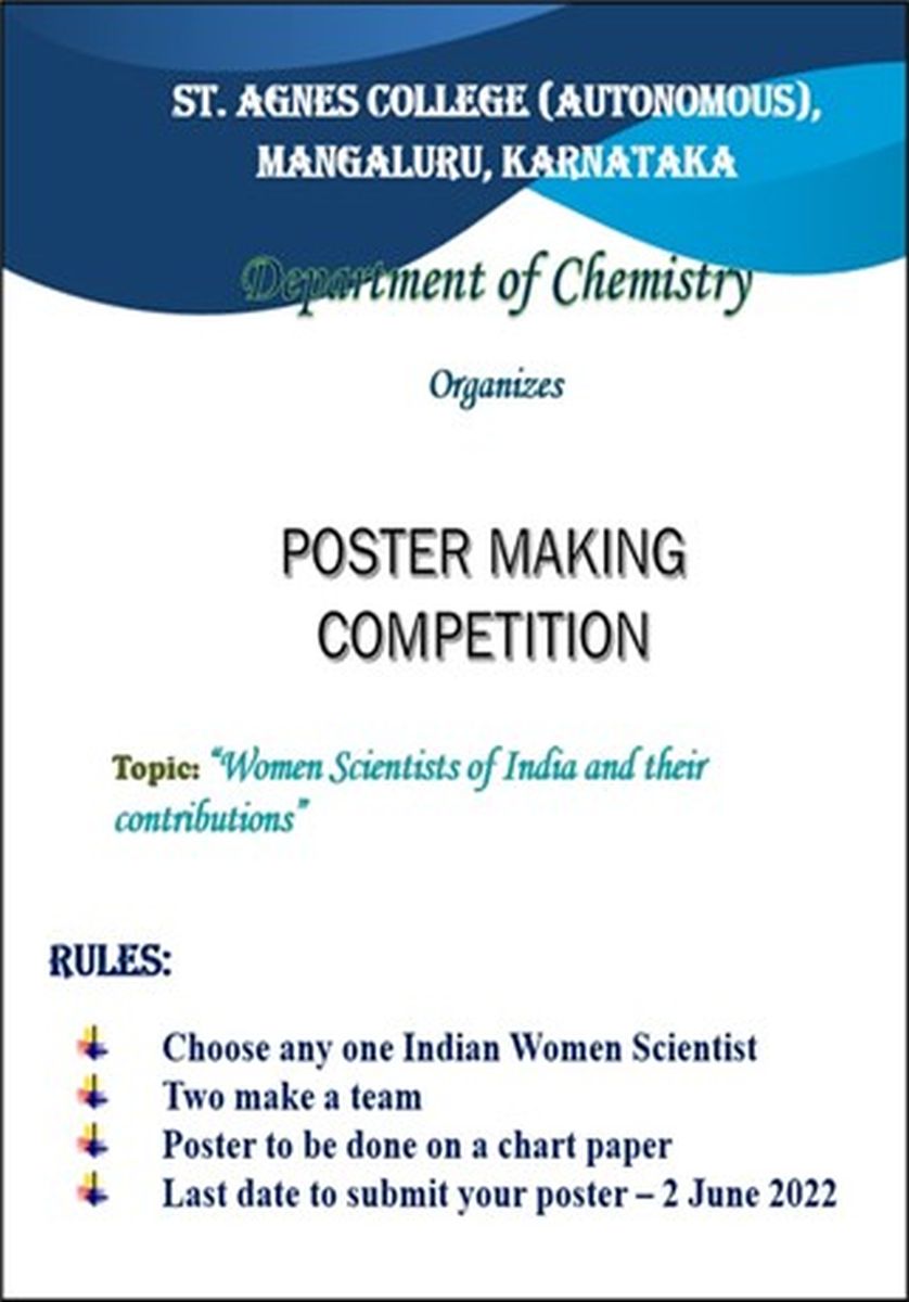 The Department of Chemistry, St Agnes College (Autonomous), Mangaluru organized poster making competitions on “Women Scientists of India and their Contributions” on 2 June 2022. 32 students participated in the competitions.