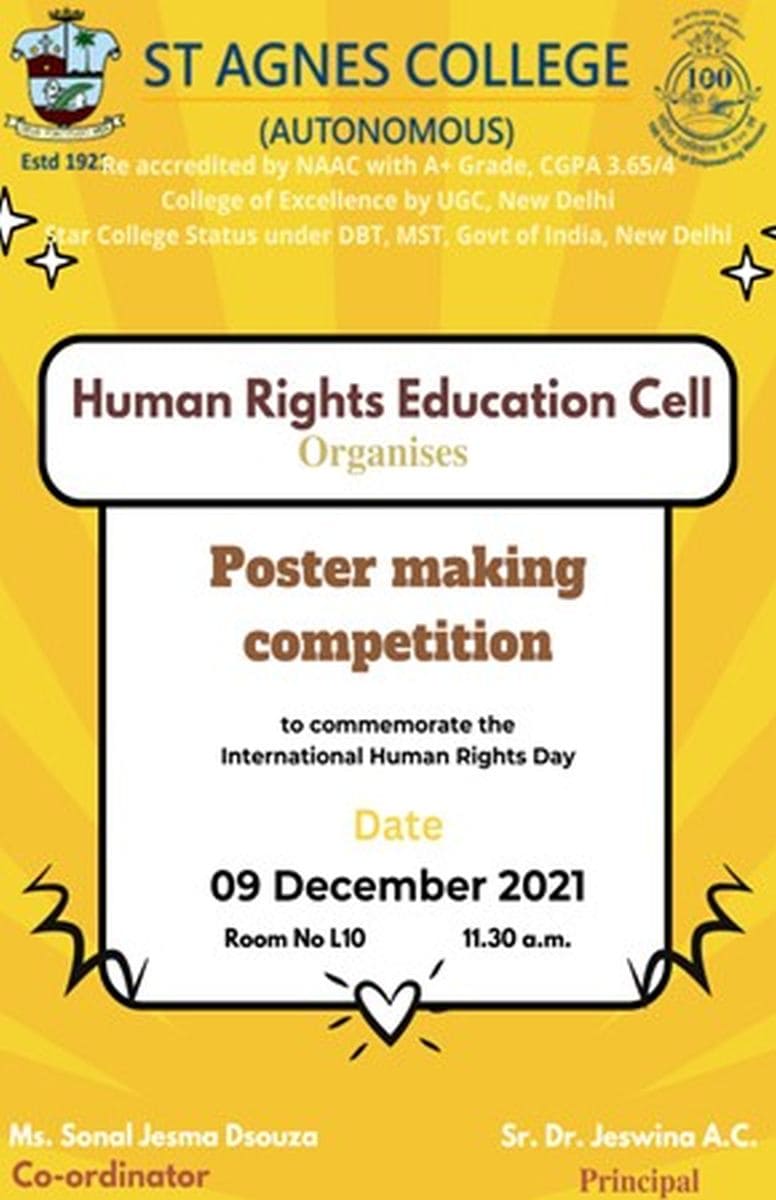 The Human Rights Education Cell, St Agnes College (Autonomous), Mangaluru organized a Poster Making Competition on the occasion of International Human Rights Day on 9 December 2021. Total 5 groups participated in the competition.