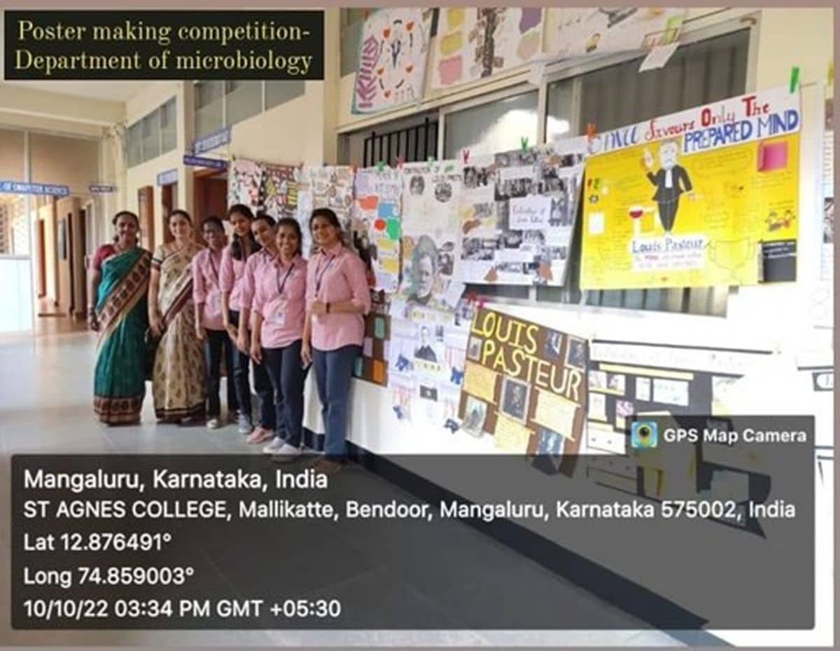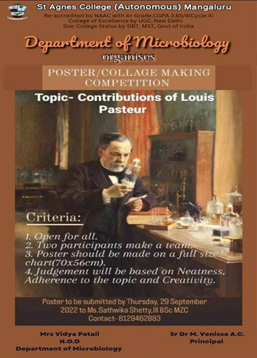A poster making competition on the topic “Contributions of Louis Pasteur” was organized on 29 September 2022 by the Department of Microbiology, St Agnes College (Autonomous), Mangaluru. This competition was open to all the streams. Forty four students participated in the competition.