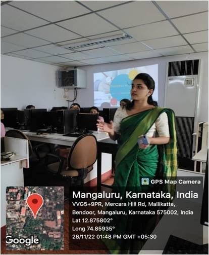 The Department of Computer Applications, St Agnes College (Autonomous), Mangaluru organised a technical student enrichment programme on “Future in the field of Artificial Intelligence” on 28 Nov 2022. Forty five students from III BCA participated in this session. The resource person was Ms Kruthika B. B., Business Development Officer from Queue Tech Solution.