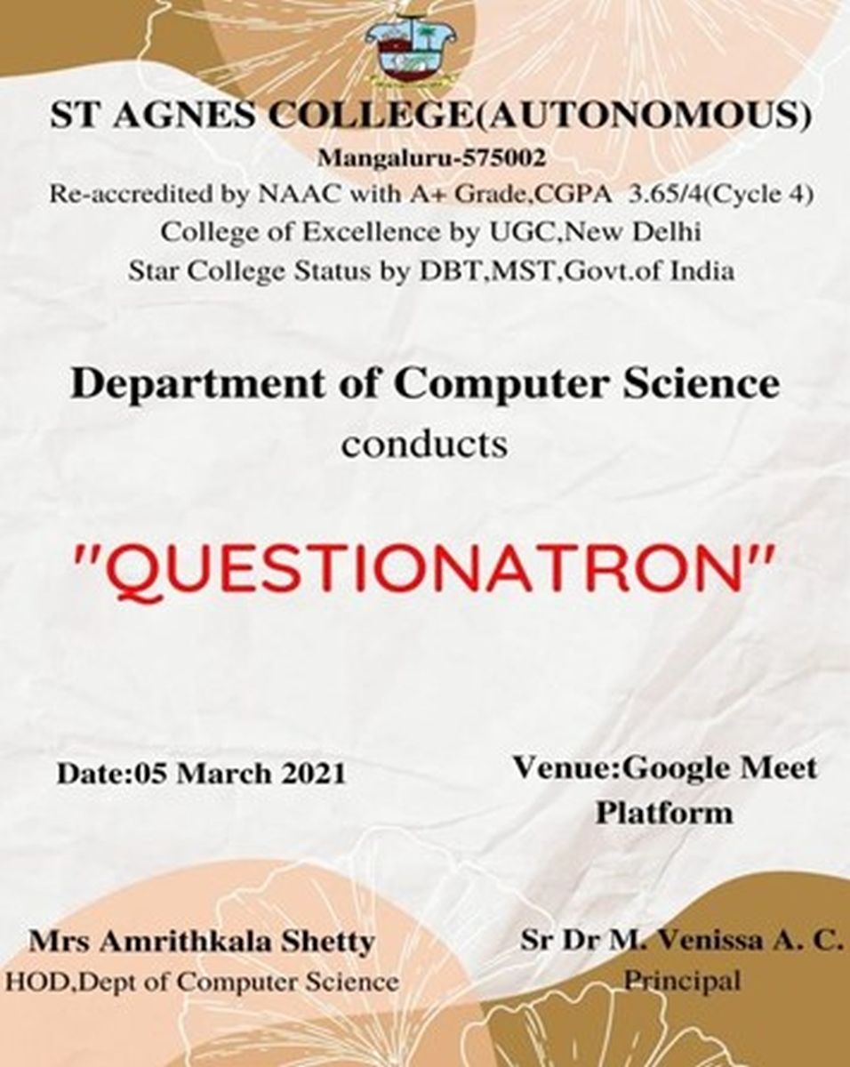 During the lockdown period, the Department of Computer Science, St Agnes College (Autonomous), Mangaluru organized Questionatron – IT quiz using Google forms on 5 March 2021. The students answered the quiz online. Time duration was 15 minutes. Fifteen students participated in this competition.
