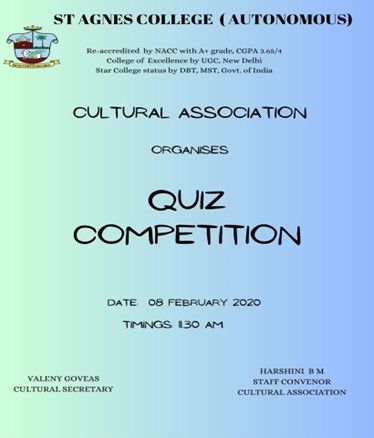 “BRAIN TEASER” a quiz competition was conducted by the Cultural Association, St Agnes College (Autonomous), Mamgaluru on 8 February 2020. 50 students participated in the competition. The students were divided into 17 groups consisting of two or three members in each group. The students enthusiastically participated in the competition.