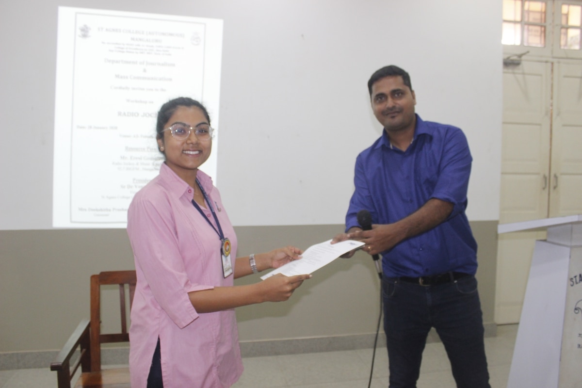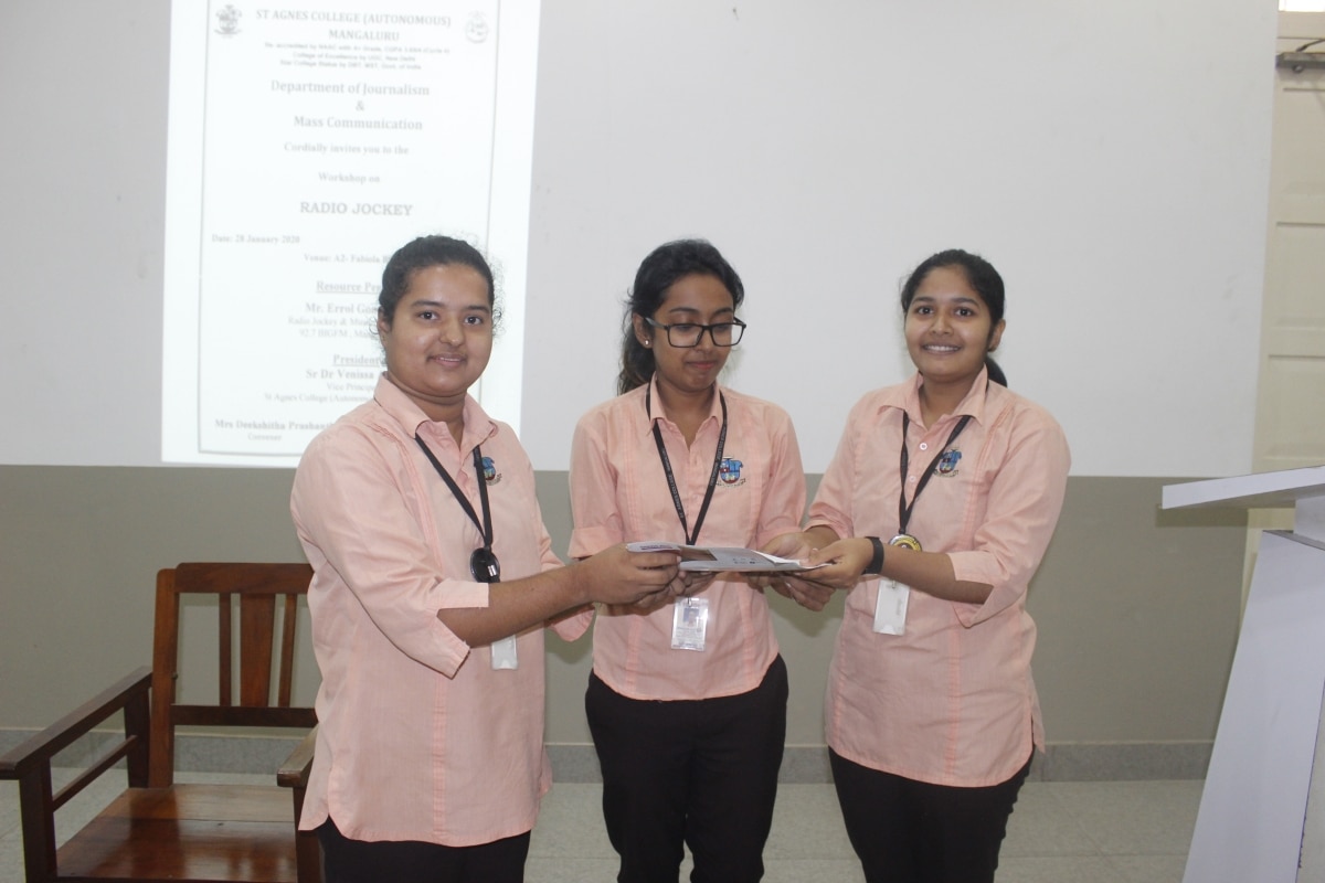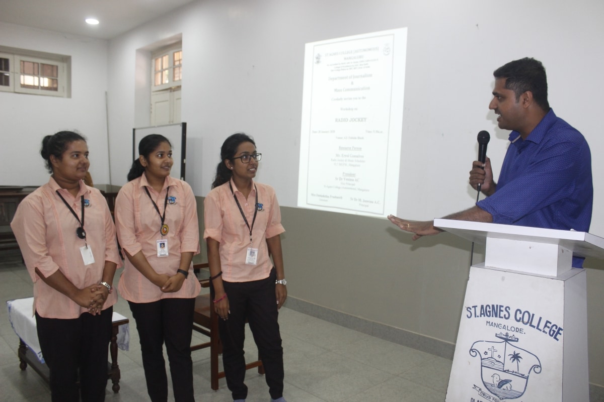 Department of Journalism and Mass Communication, St Agnes College (Autonomous) Mangaluru organised a one day workshop on Radio Jockey on 28 January 2020. Mr. Errol Gonsalves, Radio Jockey and Music Scheduler at 92.7 BIG FM, Mangaluru was the resource person of the day. “I am still a learner at Radio Industry. As a RJ with nine years of experience I still have many things to learn.” said Errol Gonsalves. Sr Dr Venissa A.C, Vice Principal of the College presided over the program. In her presidential address she said, “There may be many job aspirants in the industry but what the employers seek is skill sets and qualities along with the degree. St Agnes College has been preparing the students with such skills for the competitive industry”.