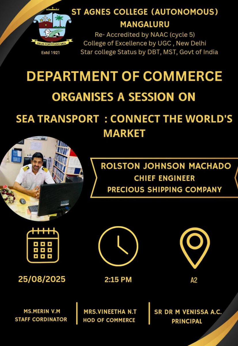 The Department of Commerce organized a highly informative session on Sea Transport: Connecting the World’s Markets for the students of B.Com, BBA, and M.Com (Logistics and Supply Chain Management) on 25th August 2025 at Avila Hall (A4). The distinguished resource person for the day was Mr. Rolston Johnson Machado, Chief Engineer at Precious Shipping Limited. The event was also graced by Mrs. Vineetha N.T., Head of the Department of Commerce, and Ms. Merin V. M., staff coordinator, along with faculty members and students.