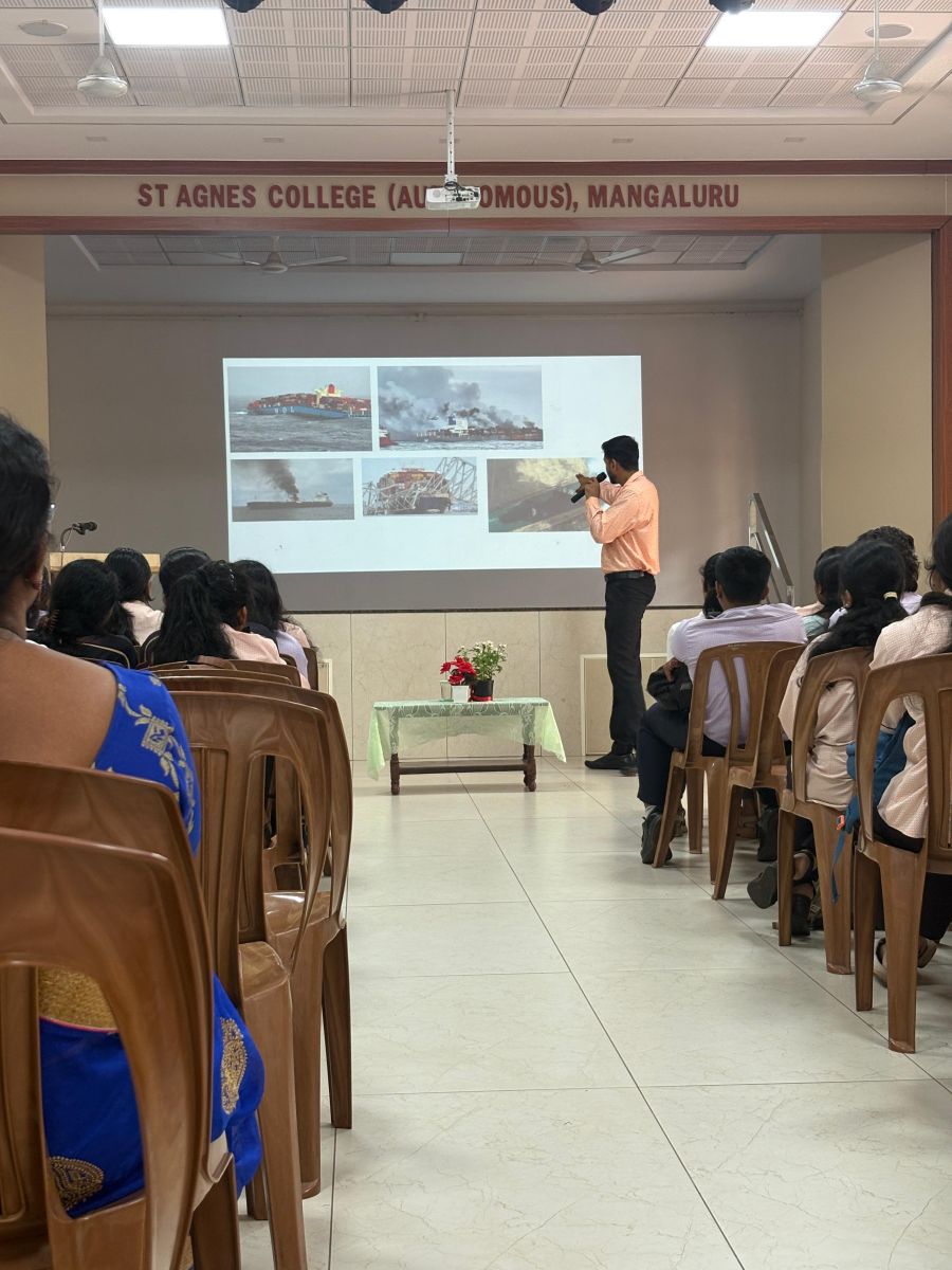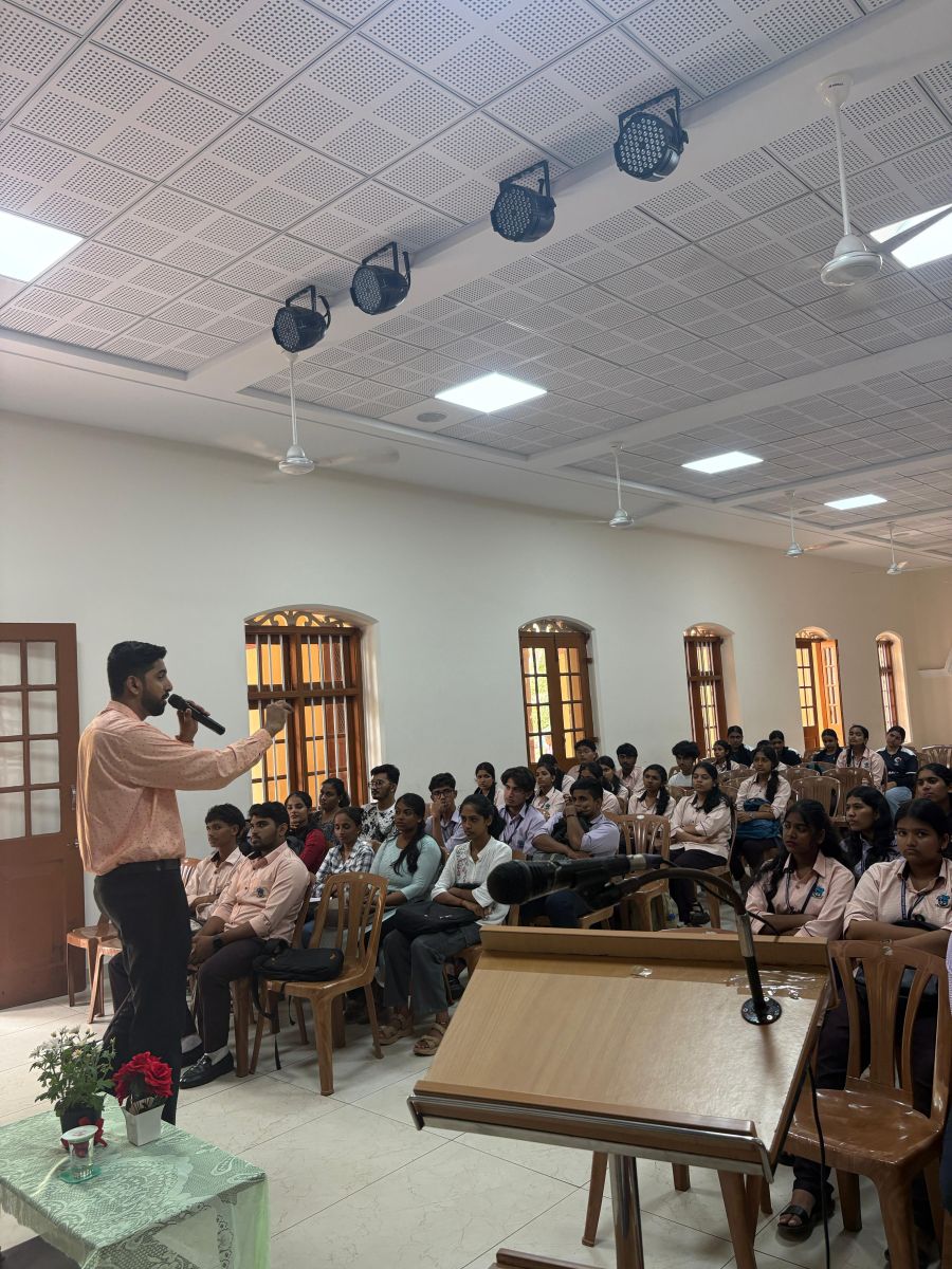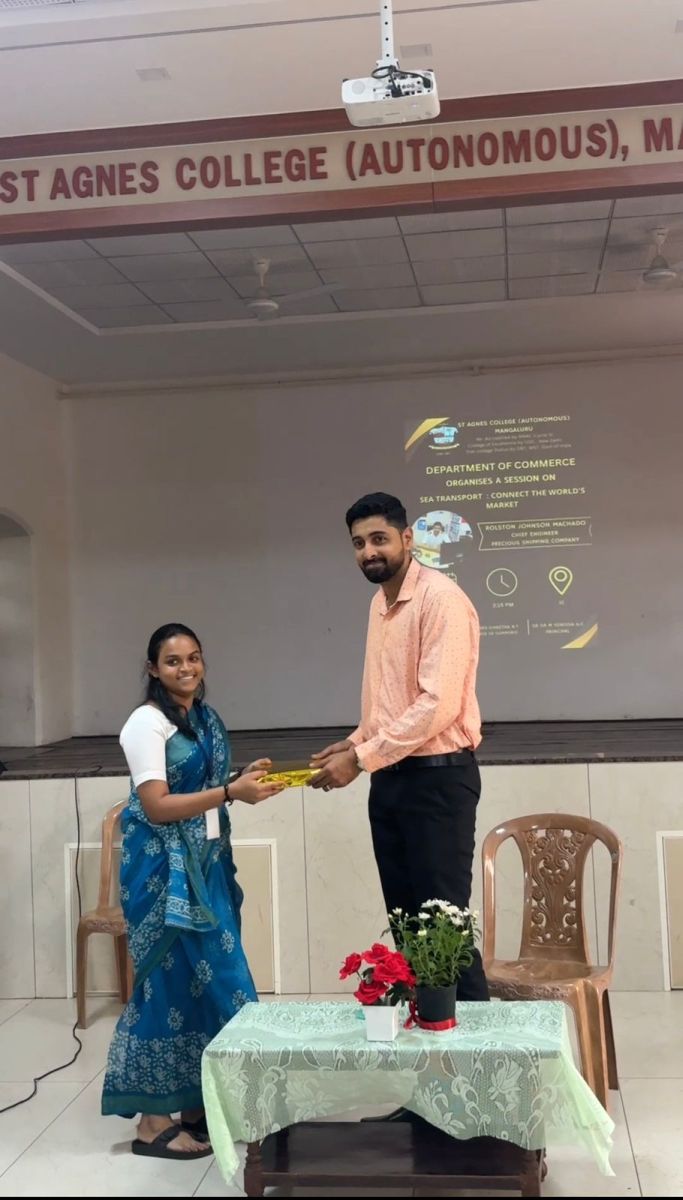 The programme commenced with a prayer song led by the B.Com students, which created a serene atmosphere. Following this, the guest speaker, Mr. Machado, delivered an enriching session in which he highlighted the vital role of sea transport in connecting global markets. He explained in detail the processes involved in shipping, including the delivery of raw materials and finished goods, the logistical framework, and the collaboration among multiple stakeholders such as shipping companies, freight forwarders, and port authorities.
