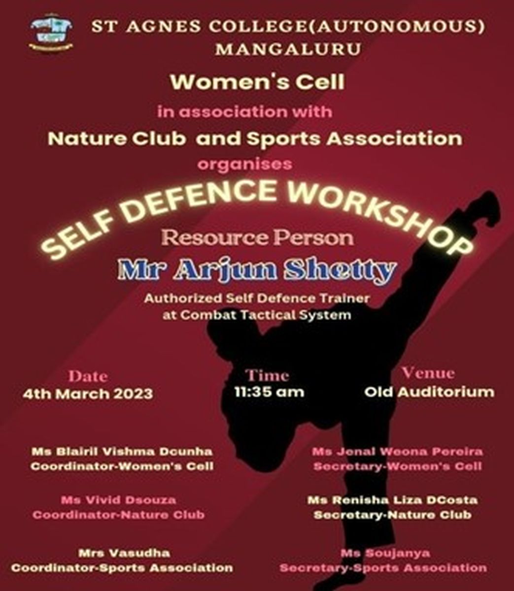 On 4 March 2023, St Agnes College (Autonomous), Mangaluru organized a collaborative workshop on “Self Defence” with active participation from 106 students. Led by Mr Arjun Shetty, an Authorized Self-Defence Trainer, and assisted by experienced Karate practitioners, the session provided valuable insights and practical demonstrations of self-defence techniques, making it impactful and appreciated by the attendees.