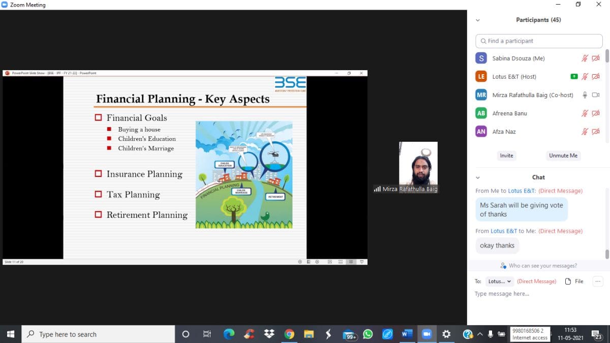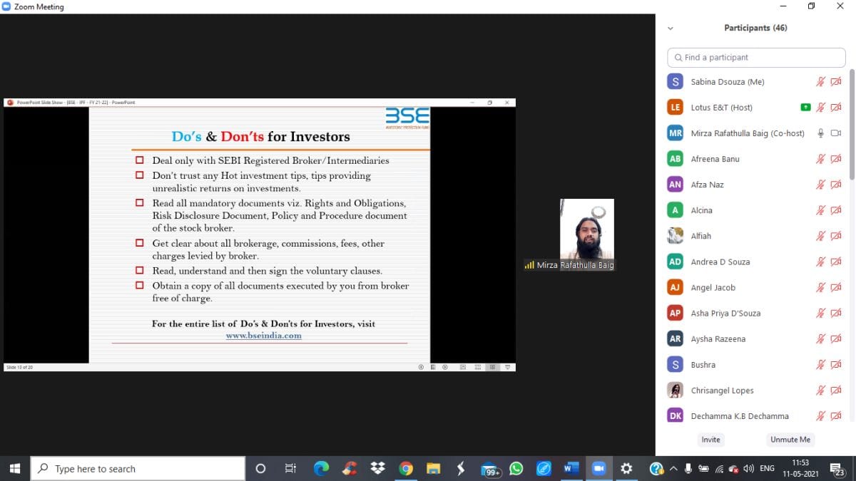 The Resource Person was Mirza Rafathulla Baig, Investment Advisor, Lotus Knowlwealth, Mumbai.