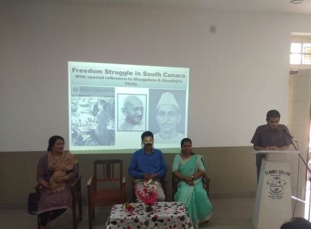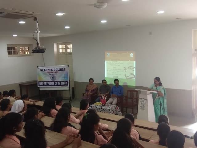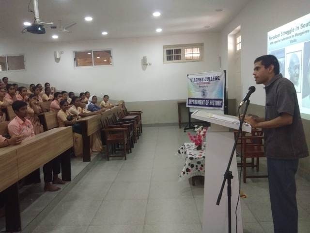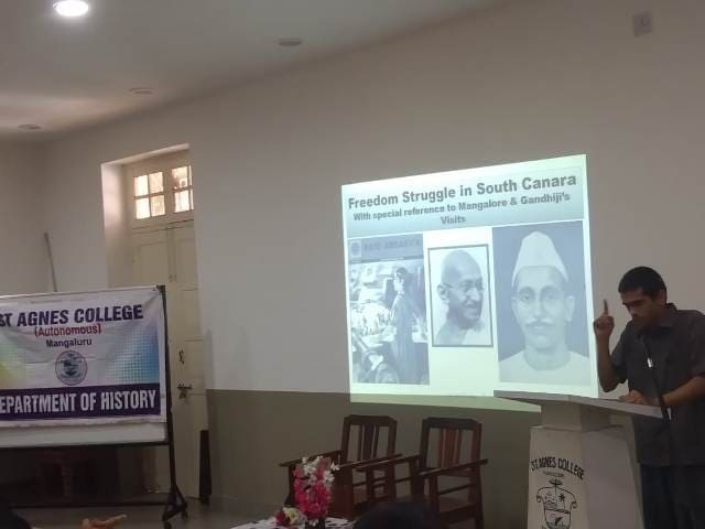 The Department of History, St Agnes College (Autonomous) in association with Centre for Gandhian Studies and Research, MGM College, Udupi organised a commemorative guest lecture on 14th August 2019 to mark 73 years of Indian Independence. Sri. Vinith Rao, Co-ordinator, Gandhian Studies and Research, MGM College, Udupi was the resource person, who delivered a talk on “Freedom struggle in South Kanara with special reference to Gandhiji’s visit to Mangalore”. Sri. Vinith Rao deliberated on the oral narratives and chronicles of the freedom movement in undivided South Kanara, documentation on Gandhiji’s visits and tours in South Kanara and the tremendous impact of the Satyagraha movement in this region. Mrs. Meera HOD of History gave an introductory note on the topic and welcomed the gathering. Mr. Charles Pais, Registrar of the College and Ms. Tiffany Barrett were present on the occasion. Ms. Sarah Monis, Student Vice President compered the programme and Ms. Faheema, proposed the Vote of Thanks.