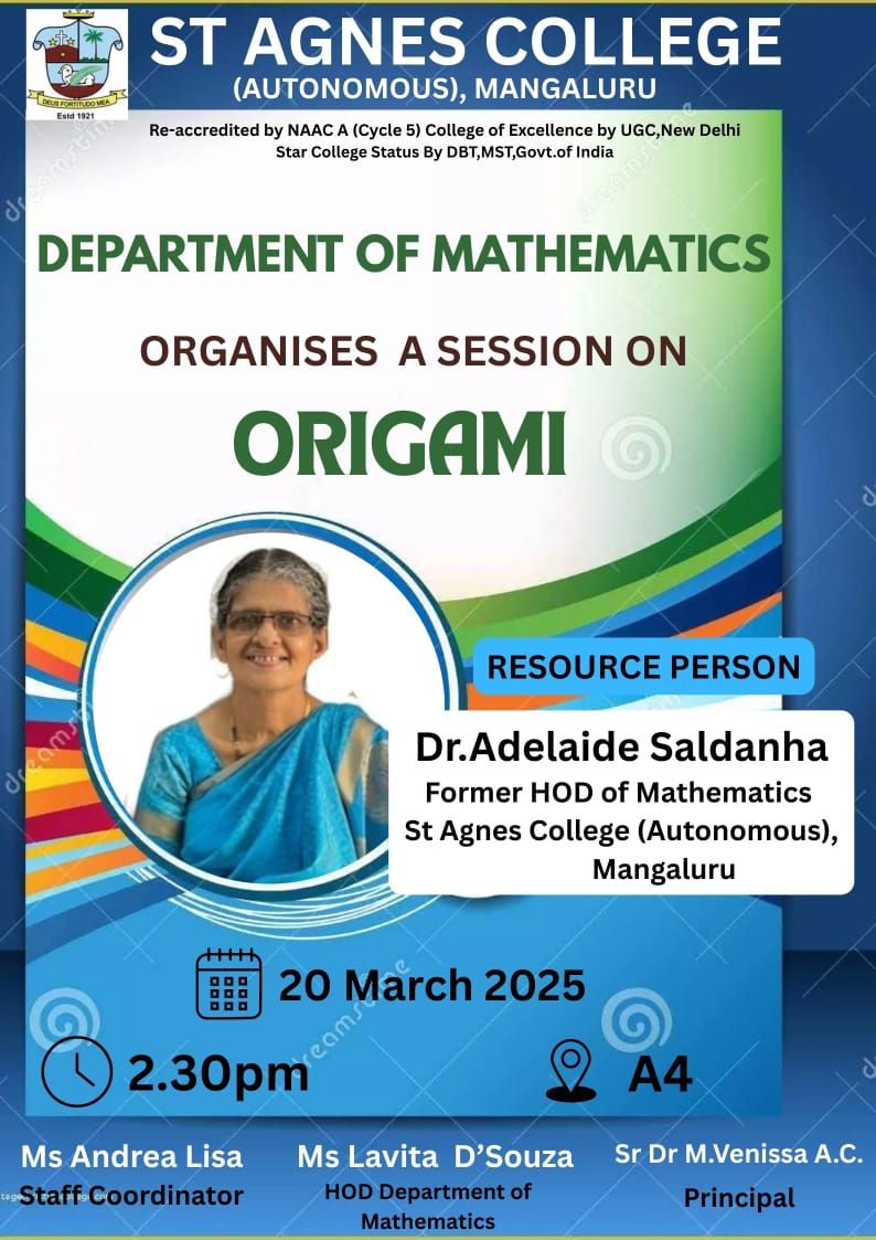 The department conducted a guest lecture on “Origami”- Origami, on 20/03/2025 which comes from Japan, involves creating beautiful shapes from a single sheet of paper without using scissors or glue by the resource person Dr.Adelaide Saldanha , the former head of the Department of Mathematics.